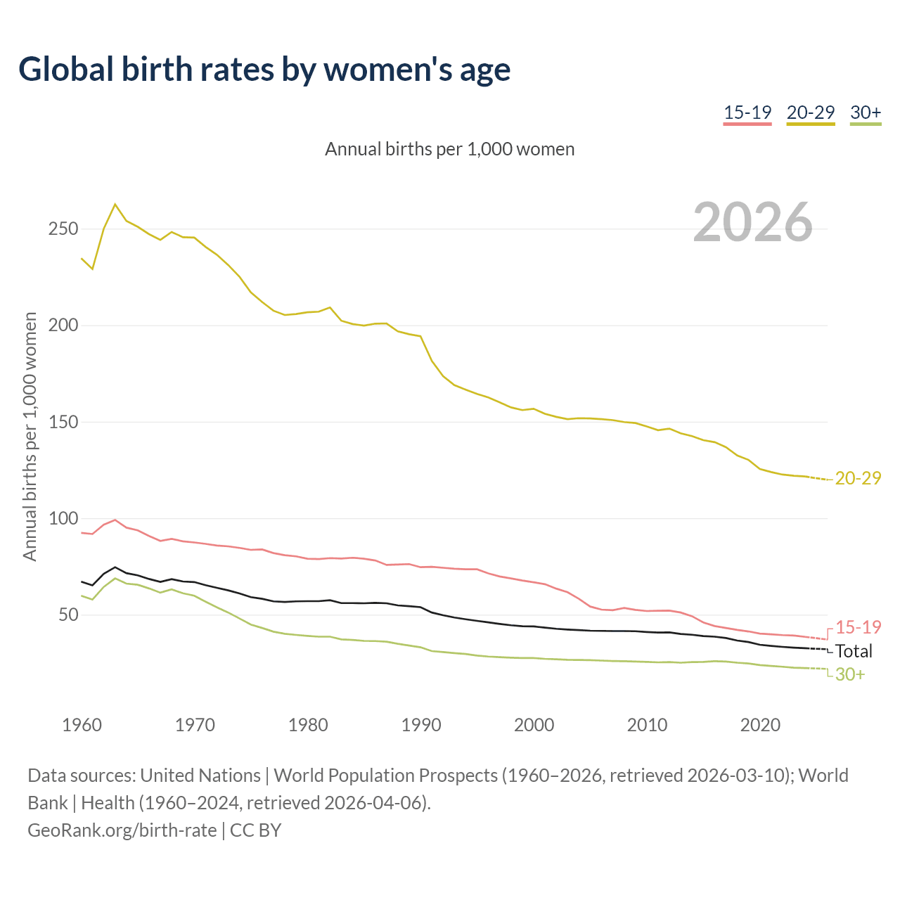 - Annual births per 1,000 women ages 15-19 (adolescent birth rate or teenage mother rate) declined from 92.1 in 1960 to 39.1 in 2023.