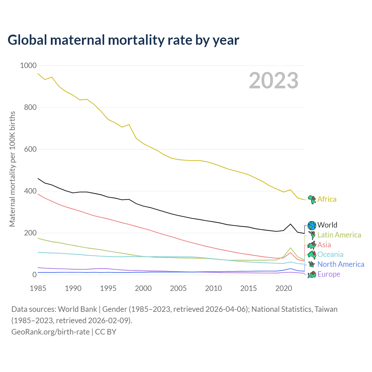 The world maternal mortality rate was 197 deaths per 100,000 live births in 2023 — a 0.2% chance of dying during childbirth or within 42 days of pregnancy termination. This is a -39.9% decrease compared to the year 2000.