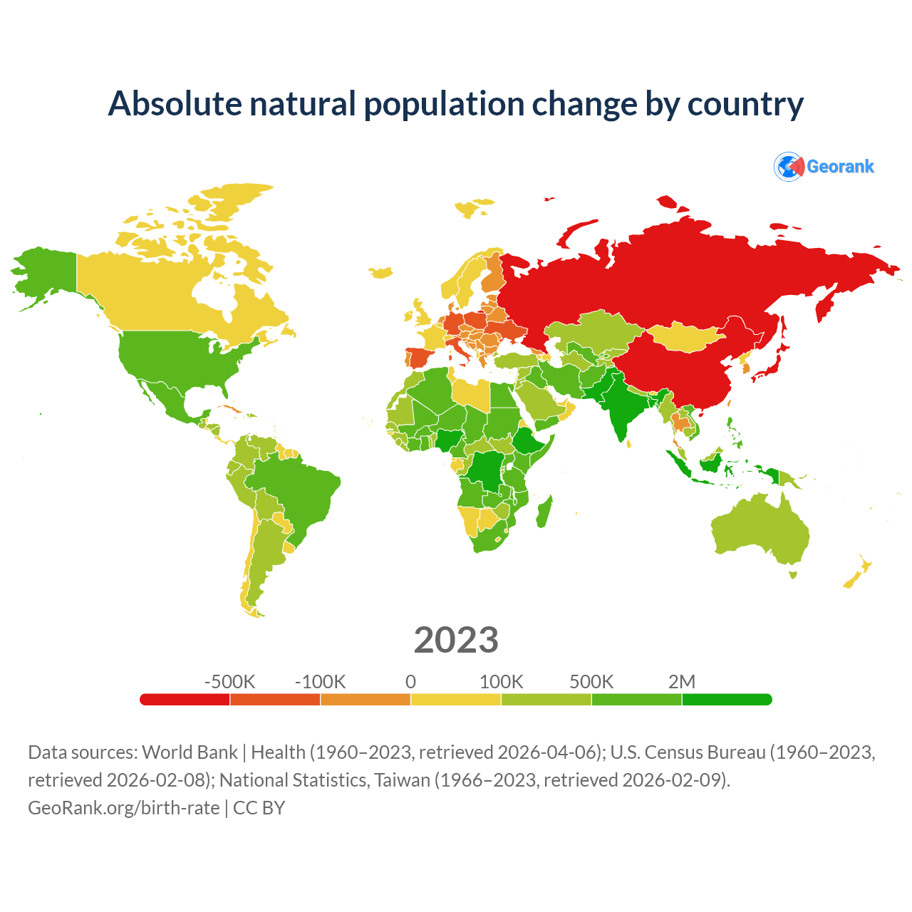 The table below ranks 196 countries by fertility rates along with the average ages at first childbirth and natural population changes — changes from births and deaths only, migration excluded.