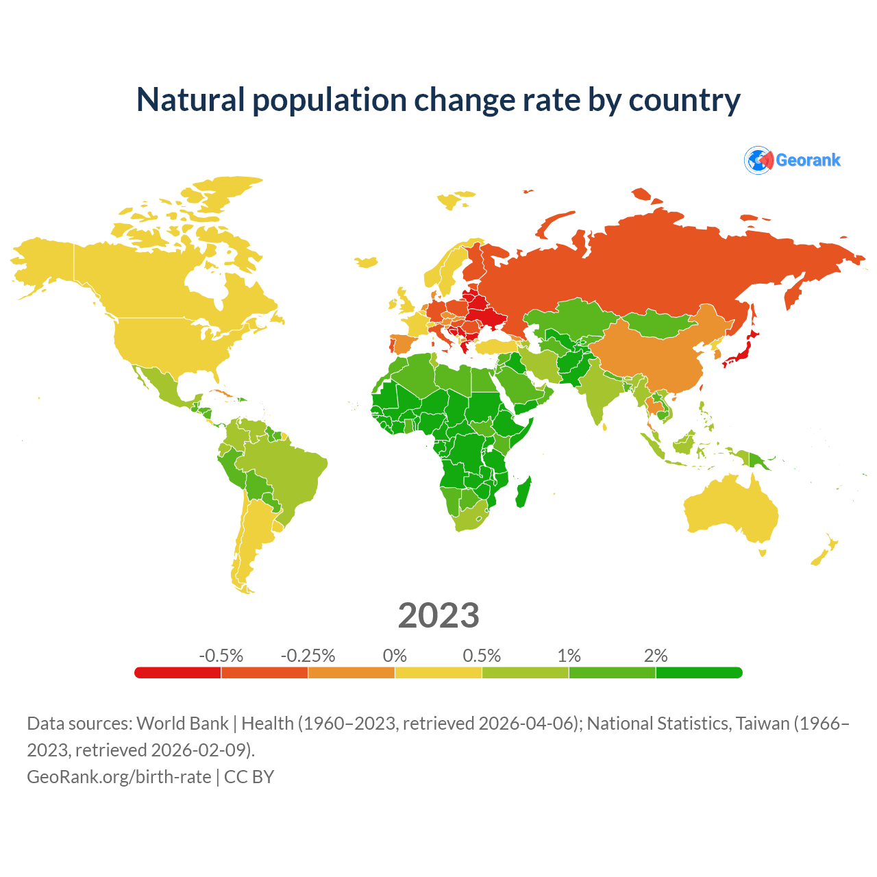 | Rank | Country | Fertility rate | Birth rate | Age at first childbirth | Natural change | Population |