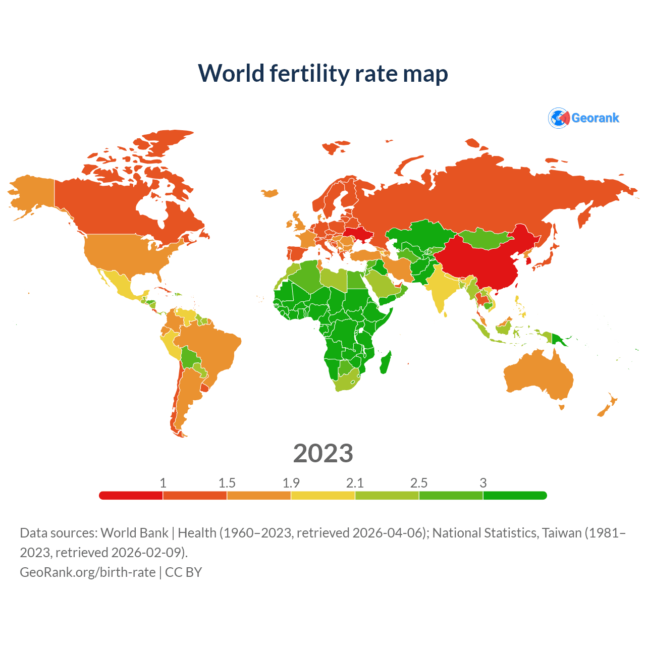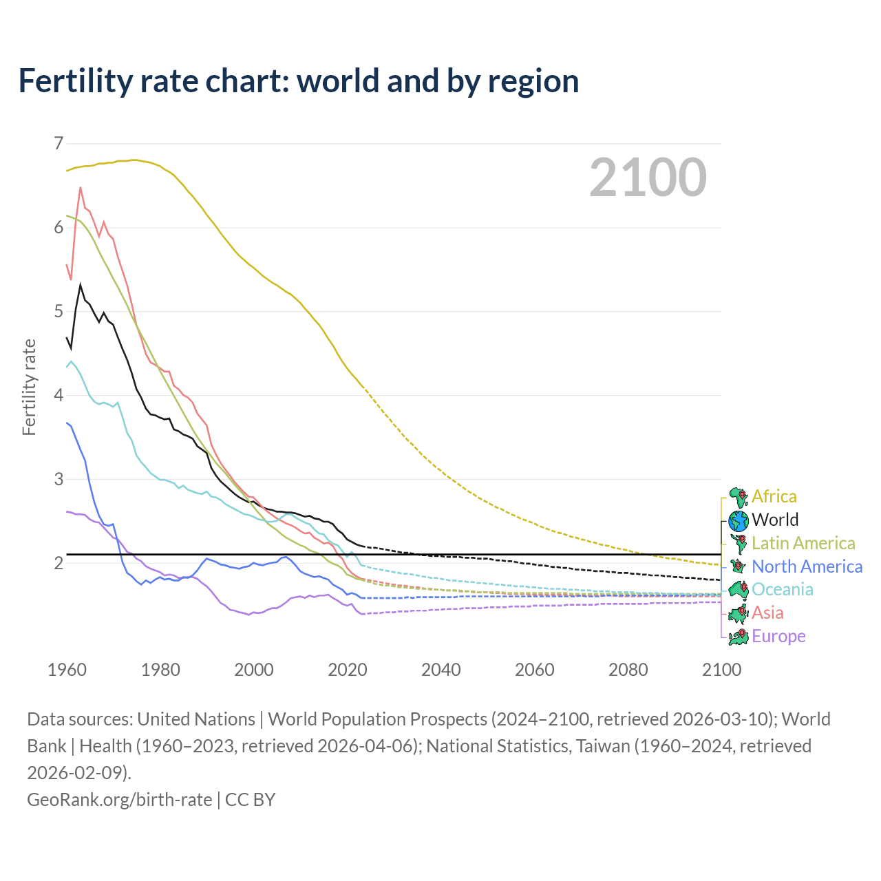 102 of the world's 197 countries, accounting for 66% of the population, have a fertility rate below the replacement threshold.