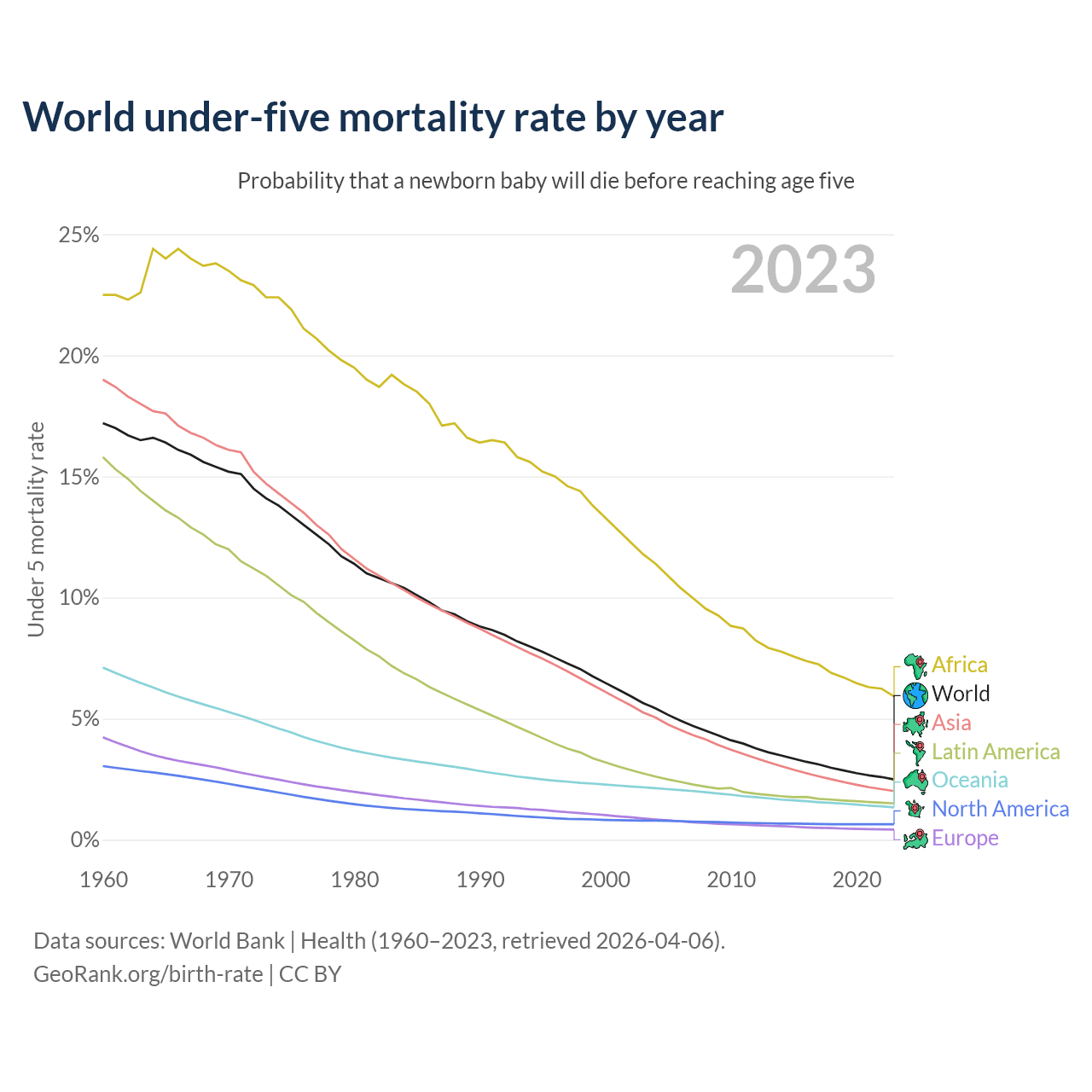 The under-5 mortality rate was 24.9 deaths per 1,000 live births in 2023 — a 2.49% chance that a newborn baby will die before reaching age five. Down from 88.1 deaths per 1,000 live births in 1990.
