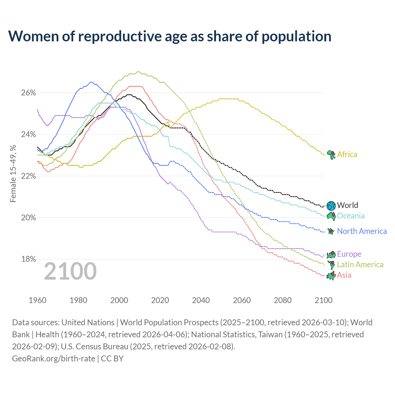 - 24.4% of the population in 2024 is composed of women of reproductive age (15-49), a change from 23.4% in 1960.
