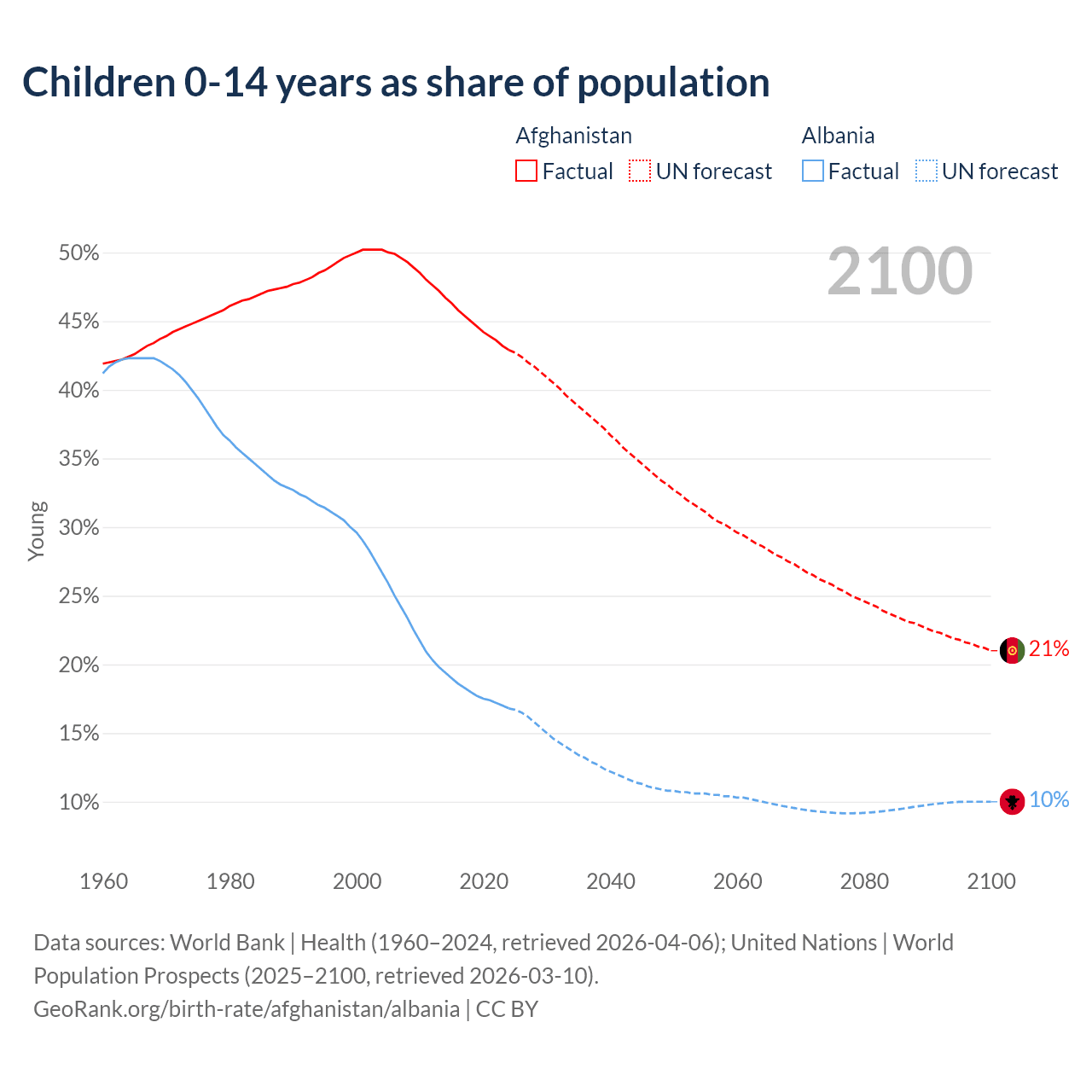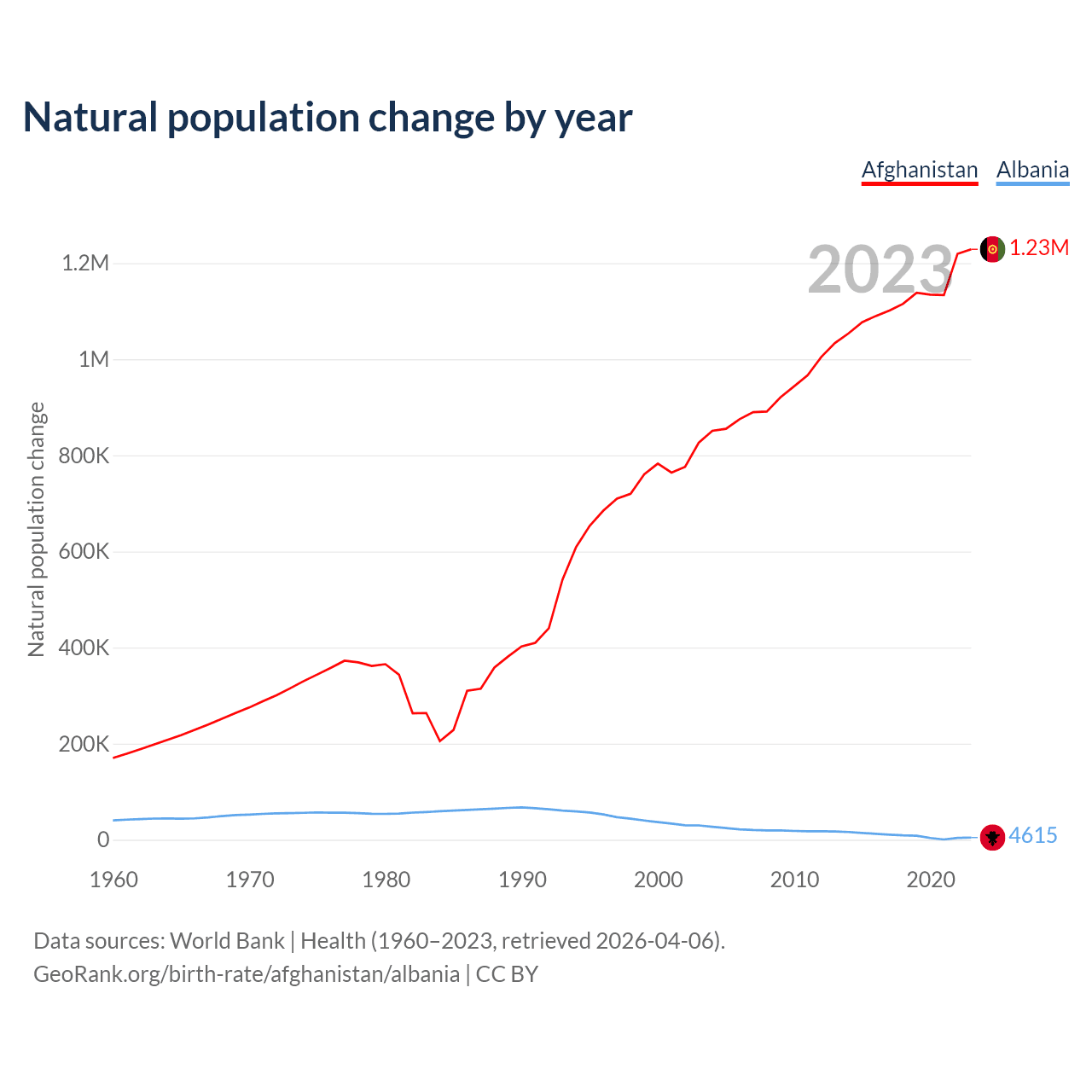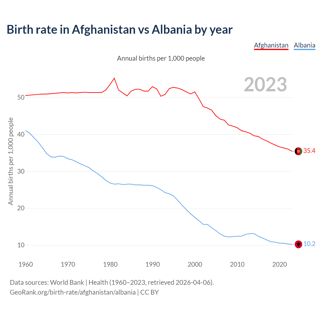 Afghanistan has an annual birth rate of 35.4 births per 1,000 people, compared to 10.2 for Albania. The average number of children a woman is expected to have during her lifetime — the fertility rate, is 4.84 in Afghanistan and 1.35 in Albania — 72.1% difference.