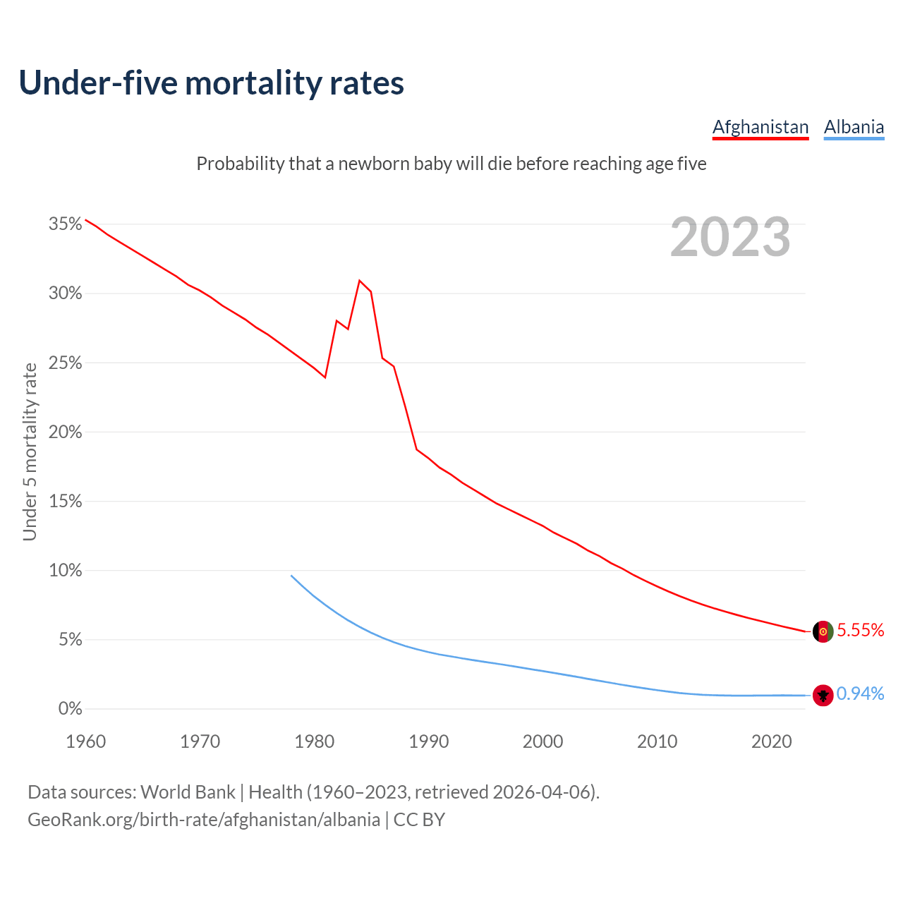 The chance that a newborn baby will die before reaching age five is 5.55% in Afghanistan and 0.94% in Albania. Above is a chart with historical data on under-five mortality rates.