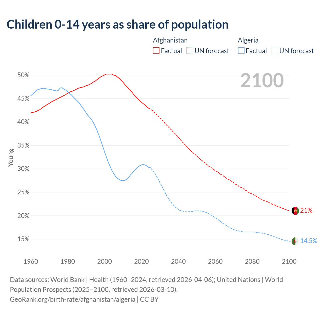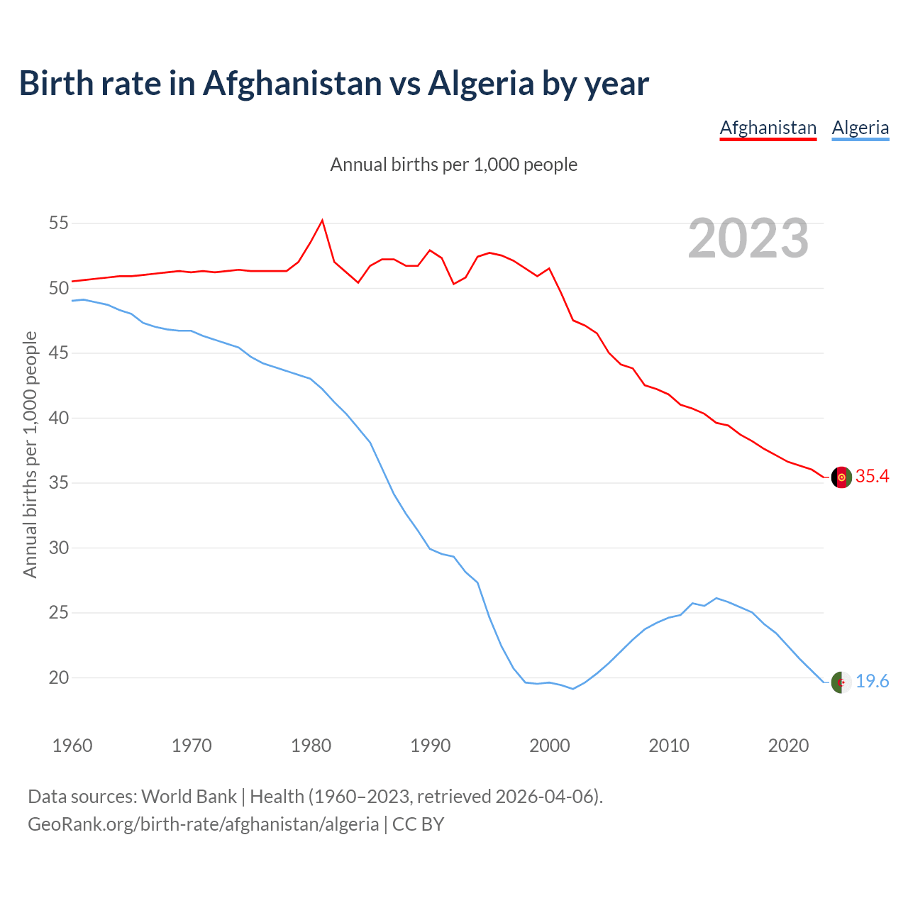 Afghanistan has an annual birth rate of 35.4 births per 1,000 people, compared to 19.6 for Algeria. The average number of children a woman is expected to have during her lifetime — the fertility rate, is 4.84 in Afghanistan and 2.77 in Algeria — 42.9% difference.