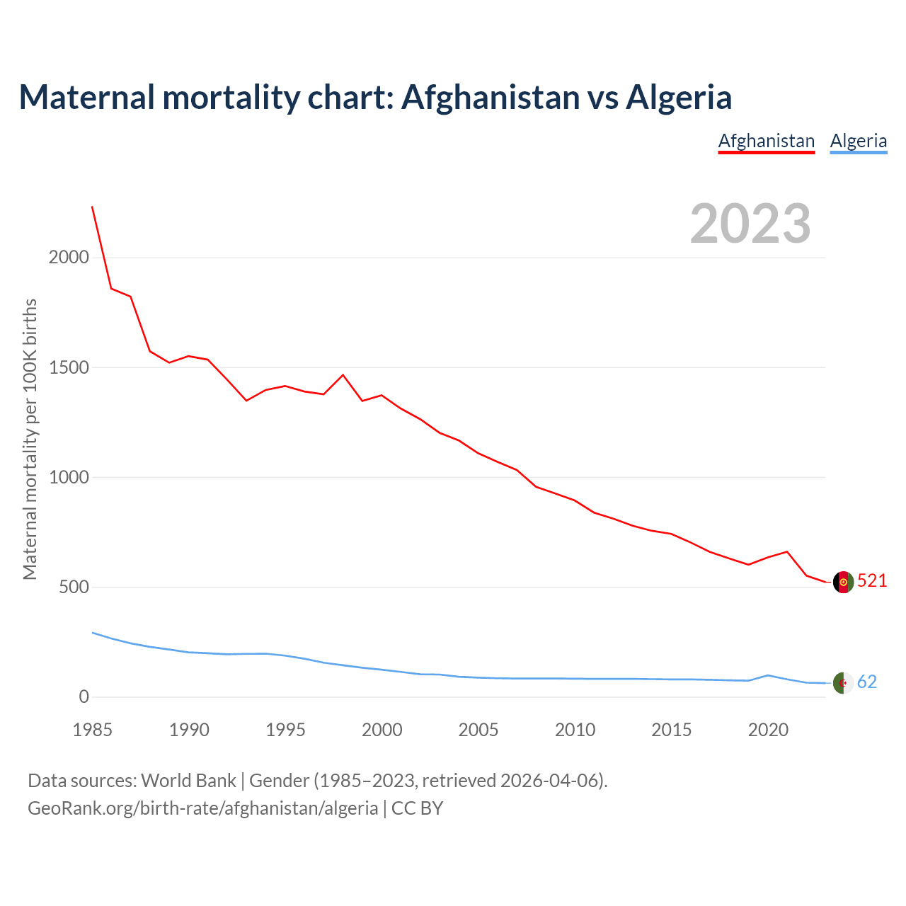 The maternal mortality rate, which is the probability of dying during childbirth or within 42 days of pregnancy termination, is 521 deaths per 100,000 live births in Afghanistan, compared to 62 deaths in Algeria.