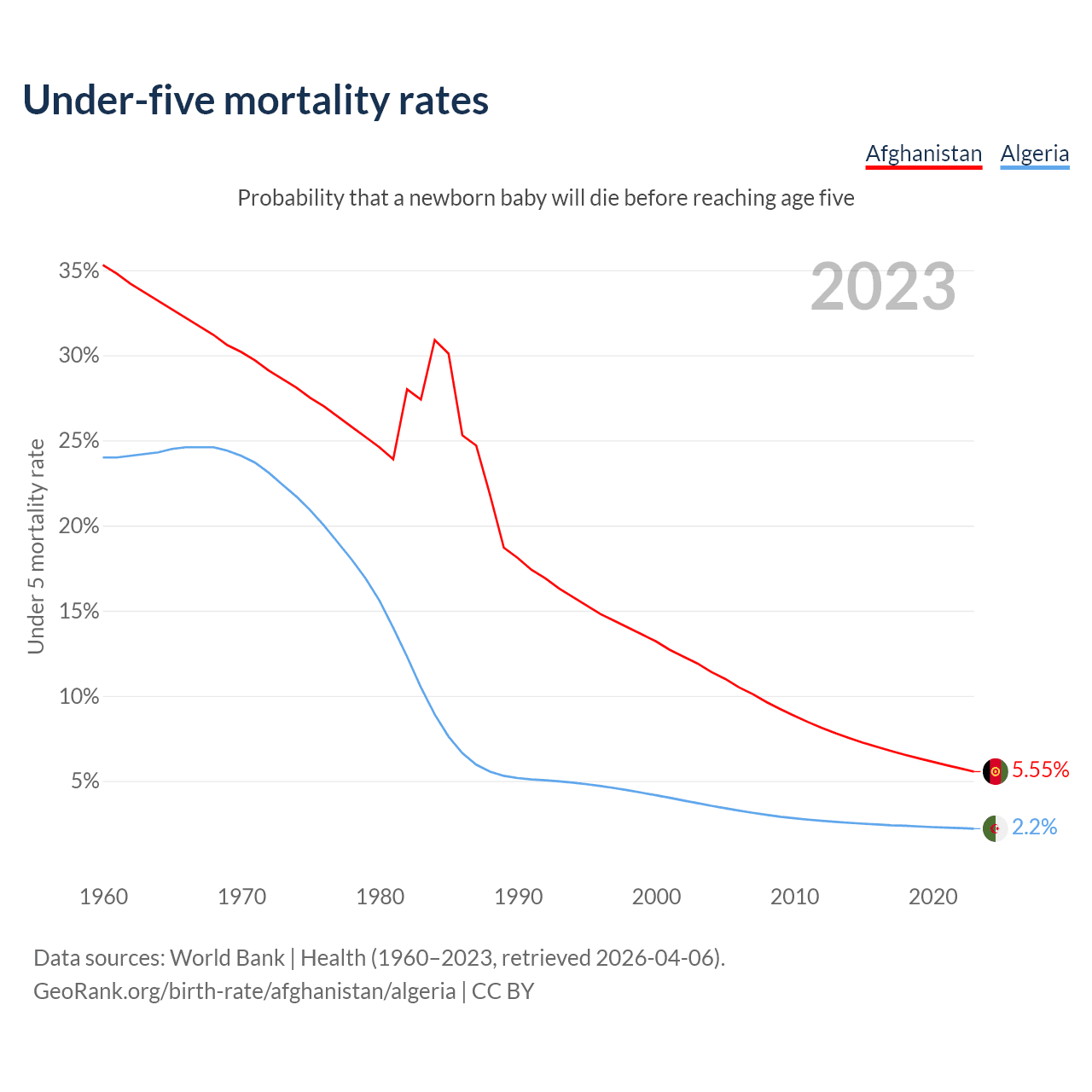 The chance that a newborn baby will die before reaching age five is 5.55% in Afghanistan and 2.2% in Algeria. Above is a chart with historical data on under-five mortality rates.