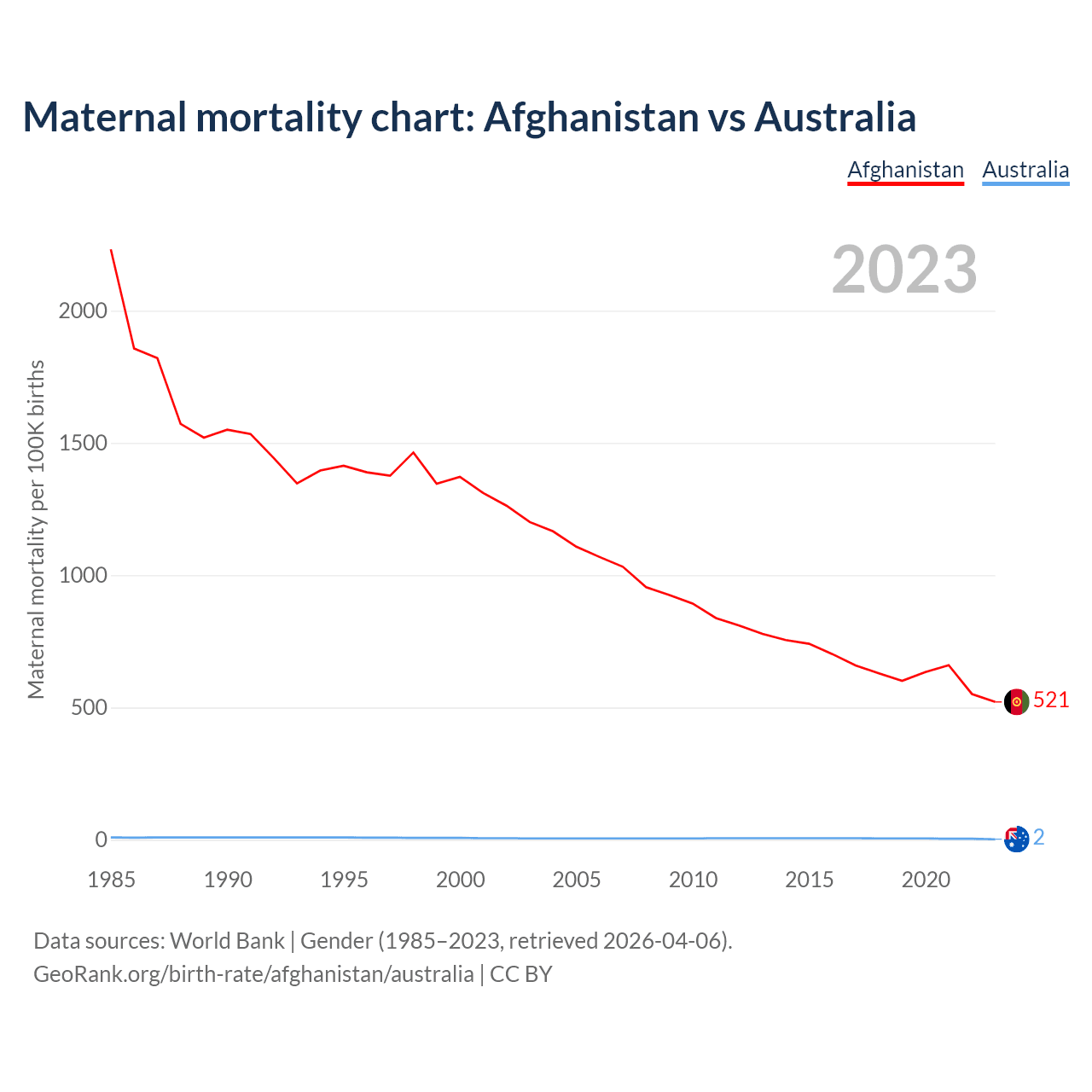 The maternal mortality rate, which is the probability of dying during childbirth or within 42 days of pregnancy termination, is 521 deaths per 100,000 live births in Afghanistan, compared to 2 deaths in Australia.
