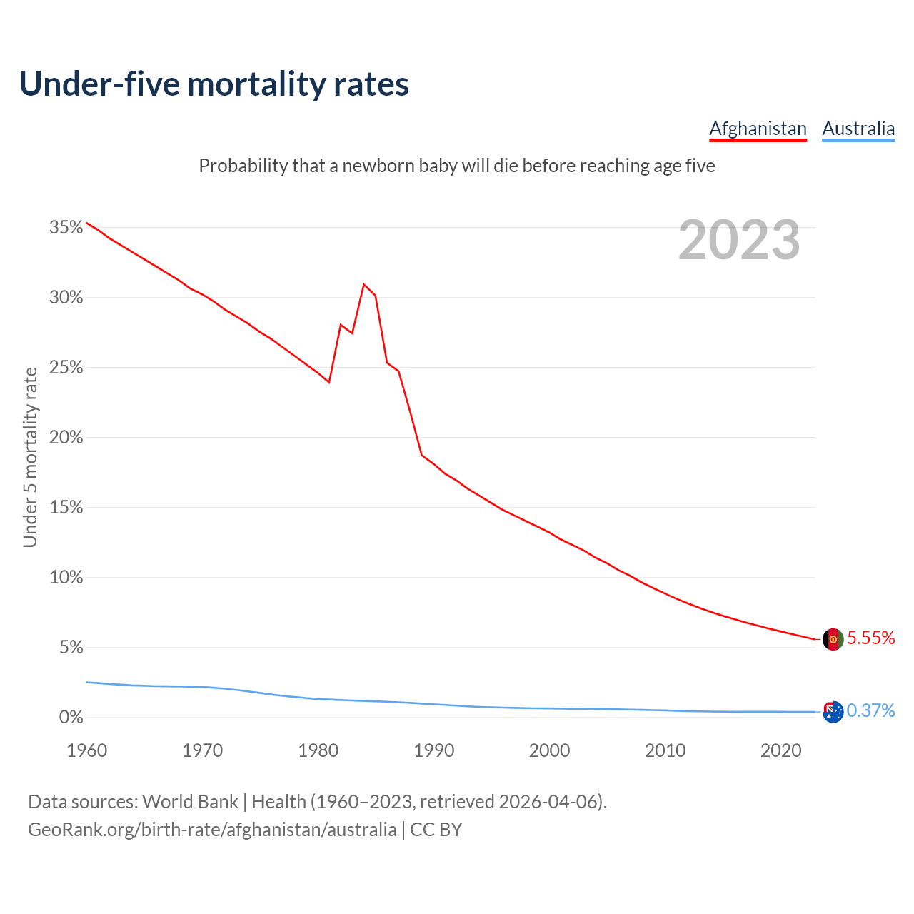 The chance that a newborn baby will die before reaching age five is 5.55% in Afghanistan and 0.37% in Australia. Above is a chart with historical data on under-five mortality rates.