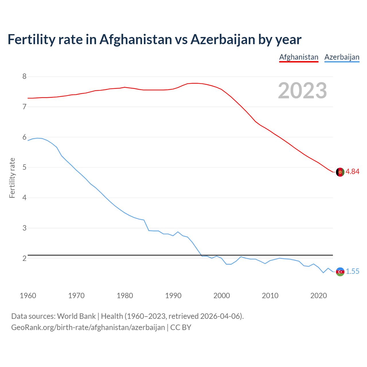 1960 vs 2023, the fertility rate has decreased by 33.5% in Afghanistan and by 73.6% in Azerbaijan — in 1960, it was 7.28 and 5.88, respectively.