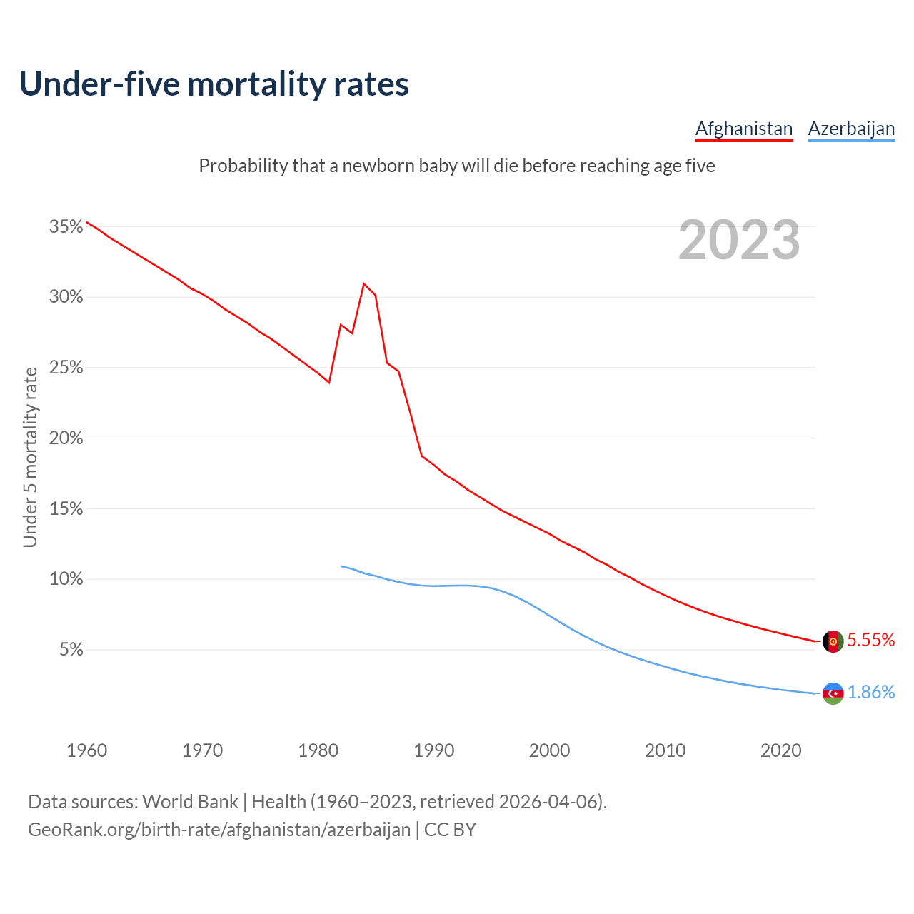 The chance that a newborn baby will die before reaching age five is 5.55% in Afghanistan and 1.86% in Azerbaijan. Above is a chart with historical data on under-five mortality rates.