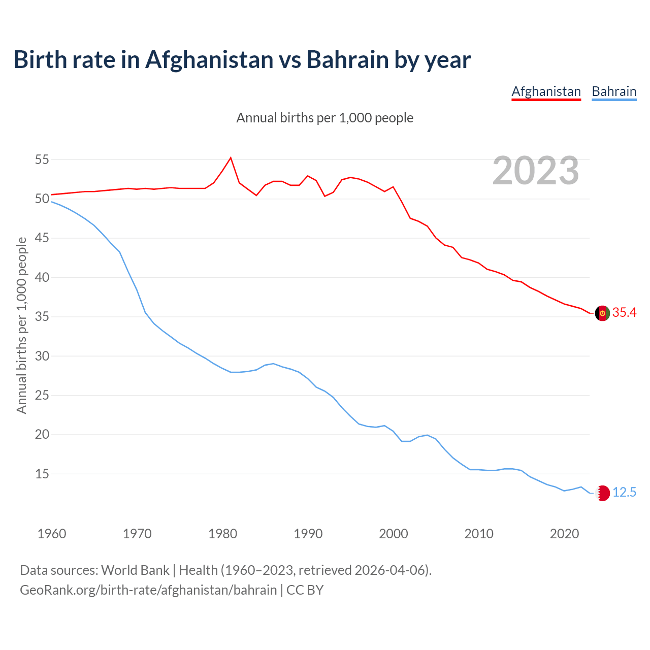 Afghanistan has an annual birth rate of 35.4 births per 1,000 people, compared to 12.5 for Bahrain. The average number of children a woman is expected to have during her lifetime — the fertility rate, is 4.84 in Afghanistan and 1.82 in Bahrain — 62.3% difference.