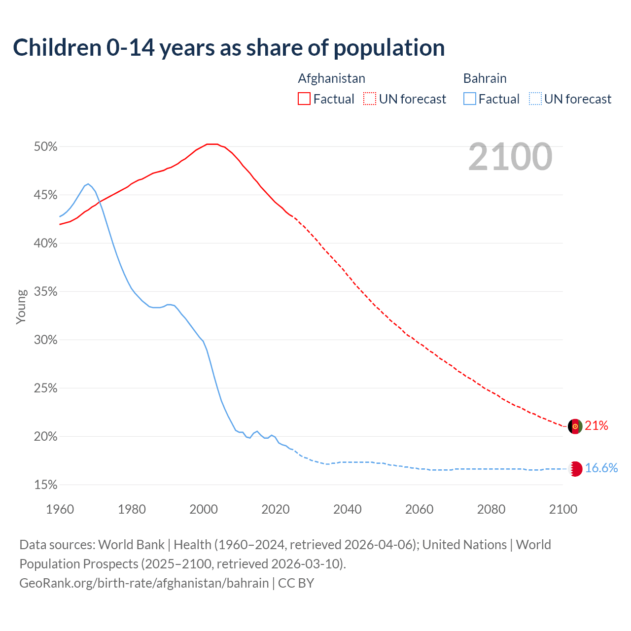 According to the latest available data on birth rates, the fertility rate in Afghanistan was 4.84 children per woman in 2023, compared to 1.82 in Bahrain in 2023. The replacement level is considered to be 2.1 children per woman.