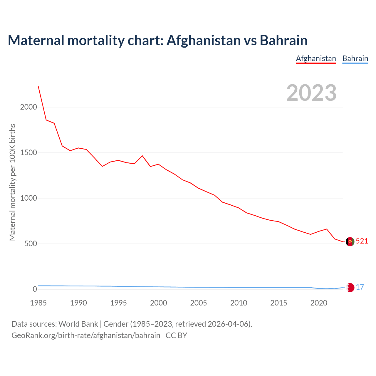 The maternal mortality rate, which is the probability of dying during childbirth or within 42 days of pregnancy termination, is 521 deaths per 100,000 live births in Afghanistan, compared to 17 deaths in Bahrain.