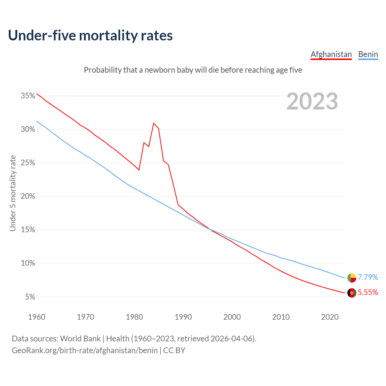 The chance that a newborn baby will die before reaching age five is 5.55% in Afghanistan and 7.79% in Benin. Above is a chart with historical data on under-five mortality rates.