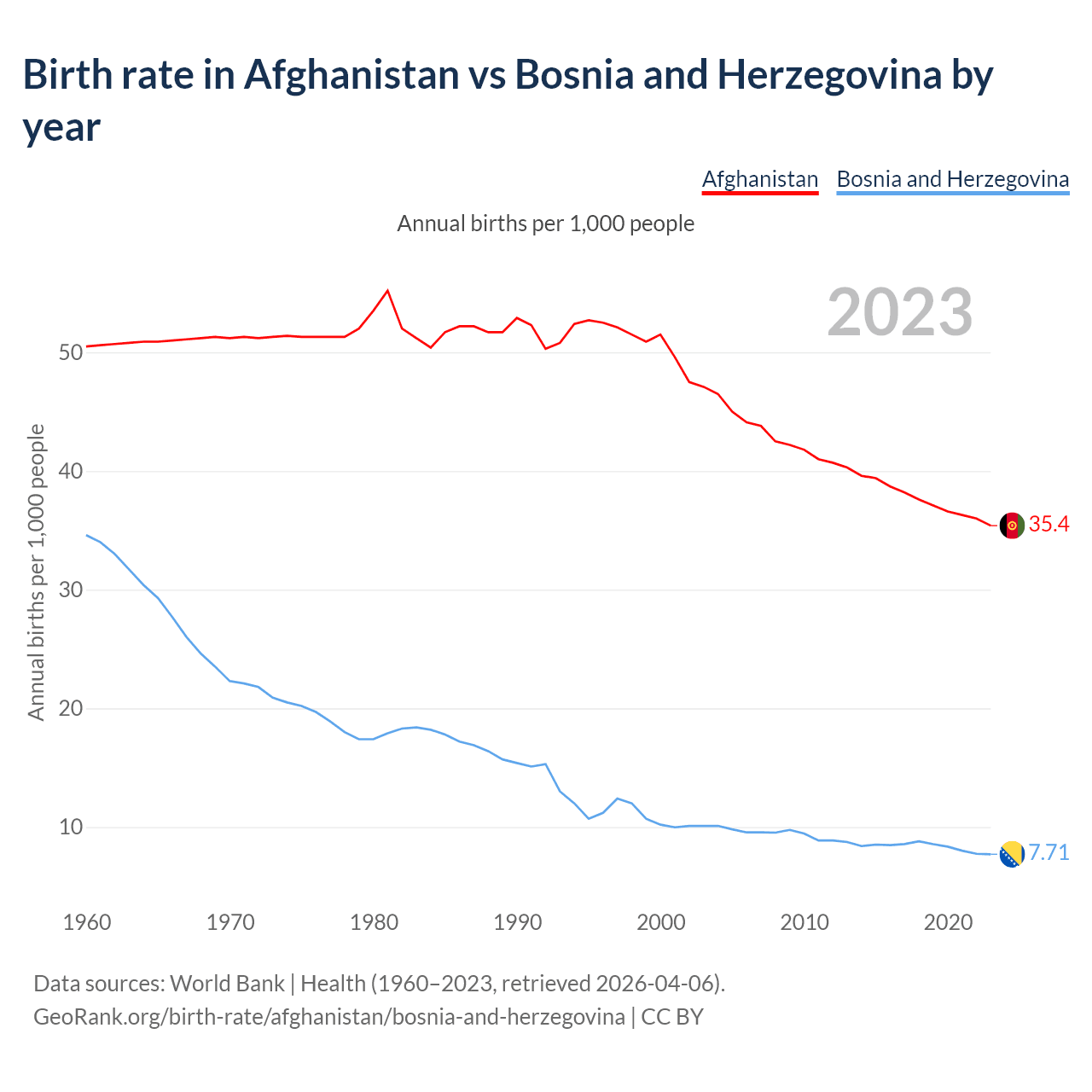 Afghanistan has an annual birth rate of 35.4 births per 1,000 people, compared to 7.71 for Bosnia and Herzegovina. The average number of children a woman is expected to have during her lifetime — the fertility rate, is 4.84 in Afghanistan and 1.49 in Bosnia and Herzegovina — 69.3% difference.
