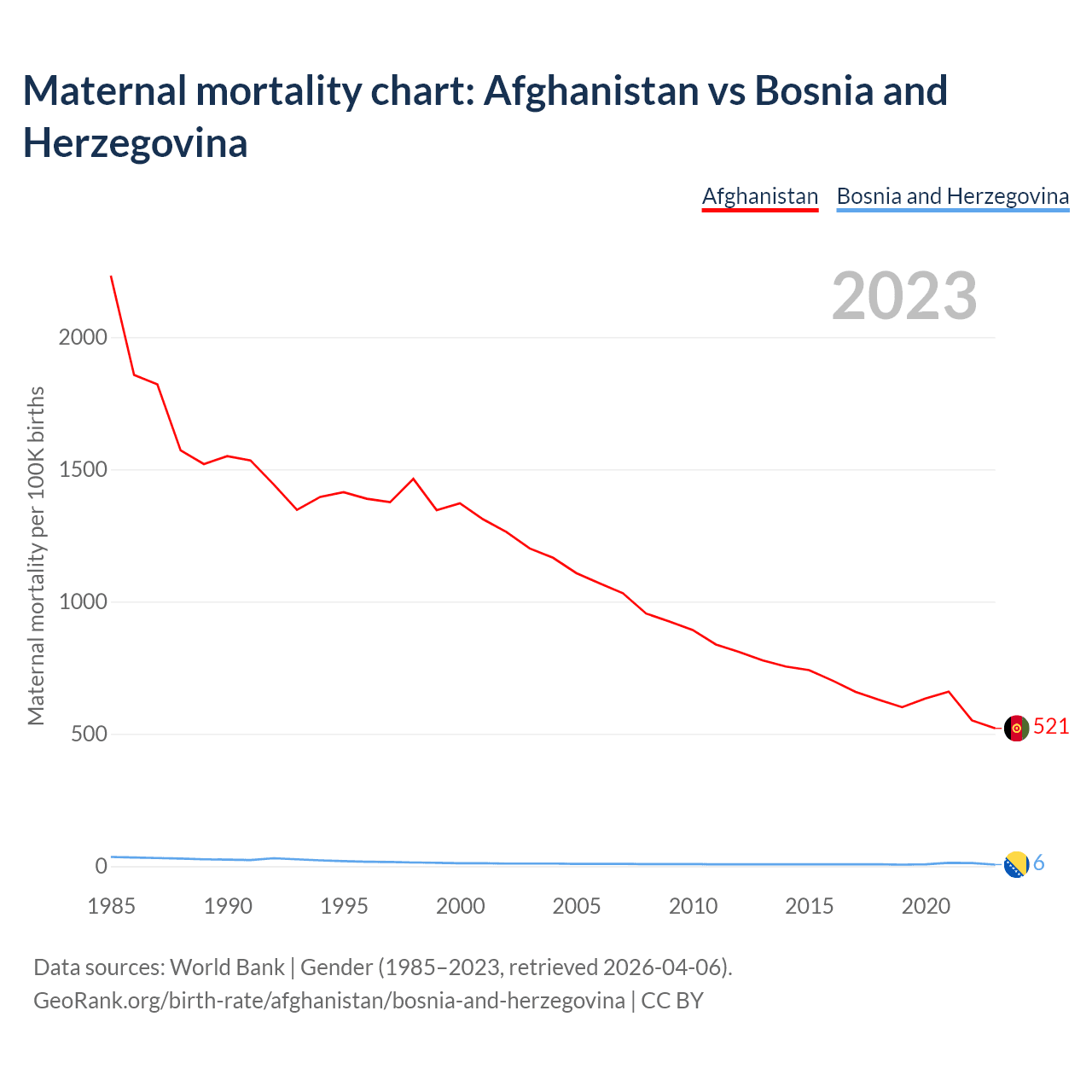 The maternal mortality rate, which is the probability of dying during childbirth or within 42 days of pregnancy termination, is 521 deaths per 100,000 live births in Afghanistan, compared to 6 deaths in Bosnia and Herzegovina.