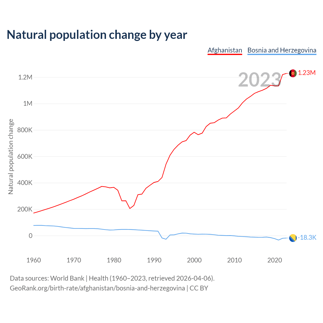 According to the latest available data on birth rates, the fertility rate in Afghanistan was 4.84 children per woman in 2023, compared to 1.49 in Bosnia and Herzegovina in 2023. The replacement level is considered to be 2.1 children per woman.