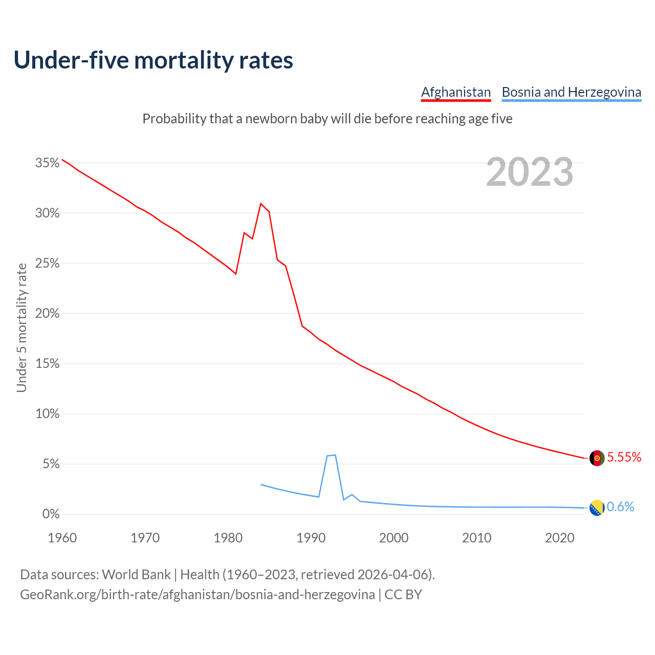 The chance that a newborn baby will die before reaching age five is 5.55% in Afghanistan and 0.6% in Bosnia and Herzegovina. Above is a chart with historical data on under-five mortality rates.