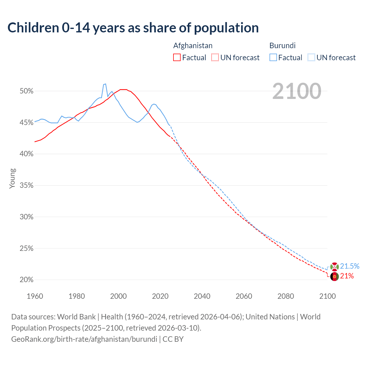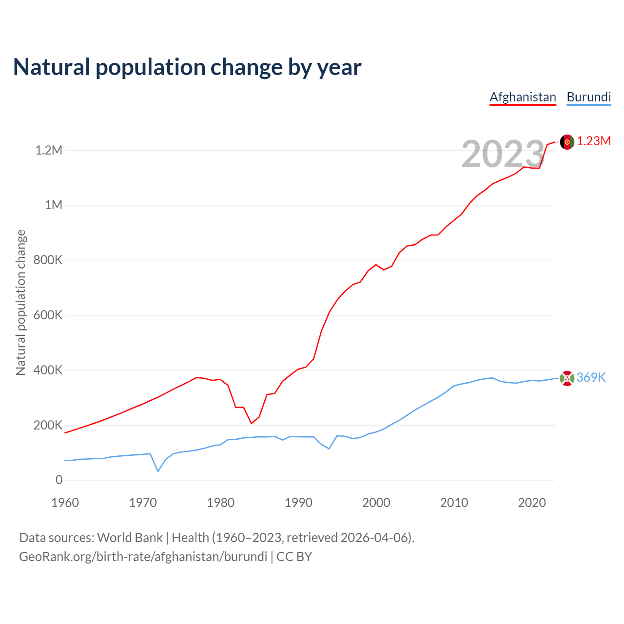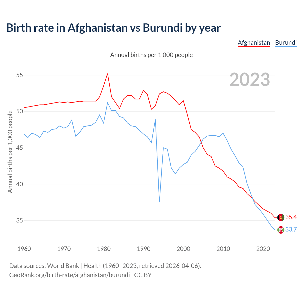 Afghanistan has an annual birth rate of 35.4 births per 1,000 people, compared to 33.7 for Burundi. The average number of children a woman is expected to have during her lifetime — the fertility rate, is 4.84 in Afghanistan and 4.88 in Burundi — 0.79% difference.
