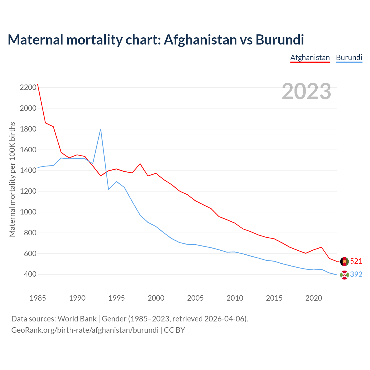 The maternal mortality rate, which is the probability of dying during childbirth or within 42 days of pregnancy termination, is 521 deaths per 100,000 live births in Afghanistan, compared to 392 deaths in Burundi.