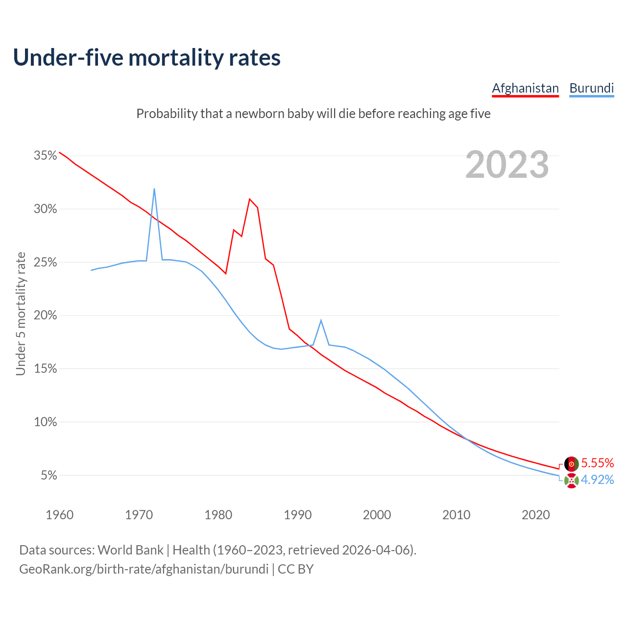The chance that a newborn baby will die before reaching age five is 5.55% in Afghanistan and 4.92% in Burundi. Above is a chart with historical data on under-five mortality rates.