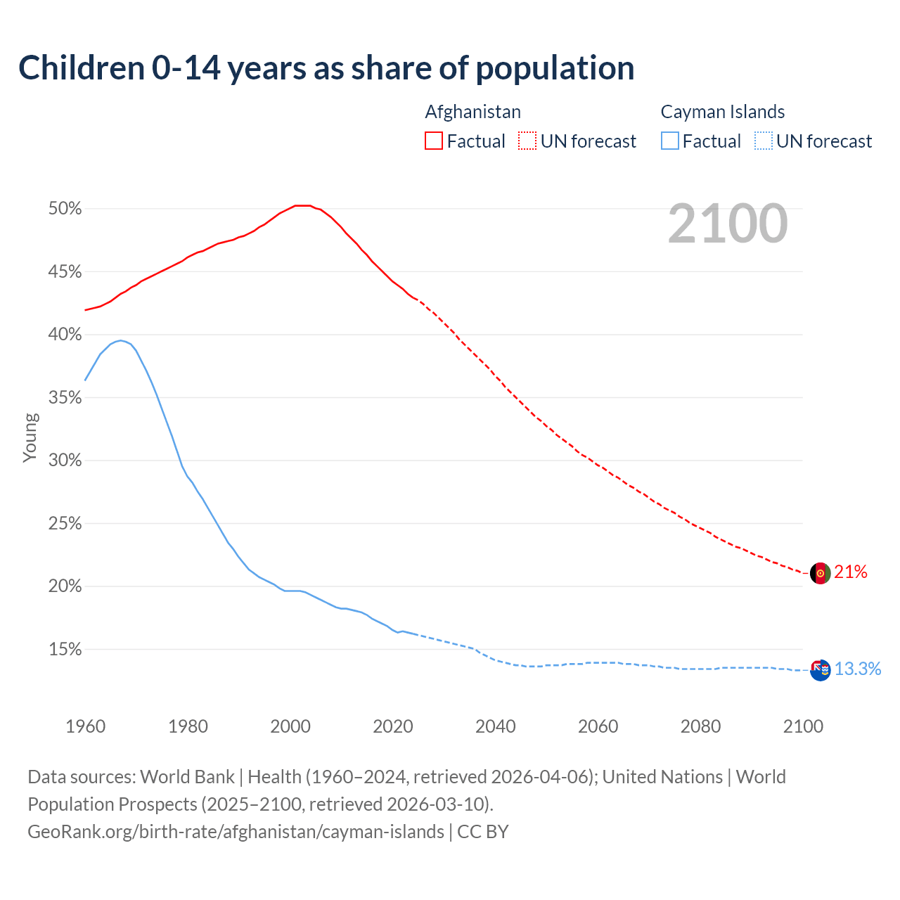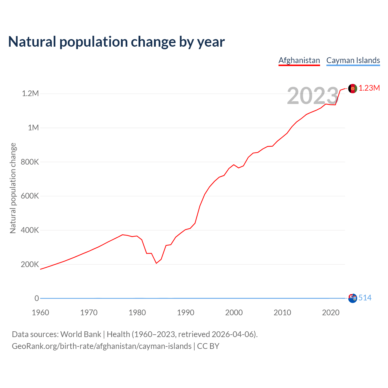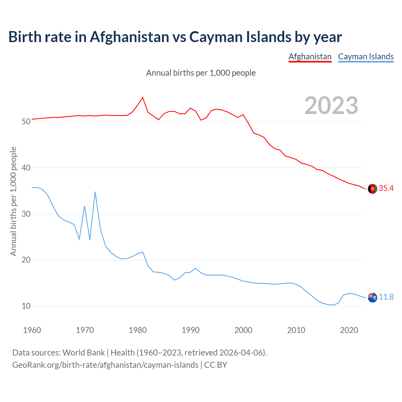 Afghanistan has an annual birth rate of 35.4 births per 1,000 people, compared to 11.8 for the Cayman Islands. The average number of children a woman is expected to have during her lifetime — the fertility rate, is 4.84 in Afghanistan and 1.53 in the Cayman Islands — 68.4% difference.