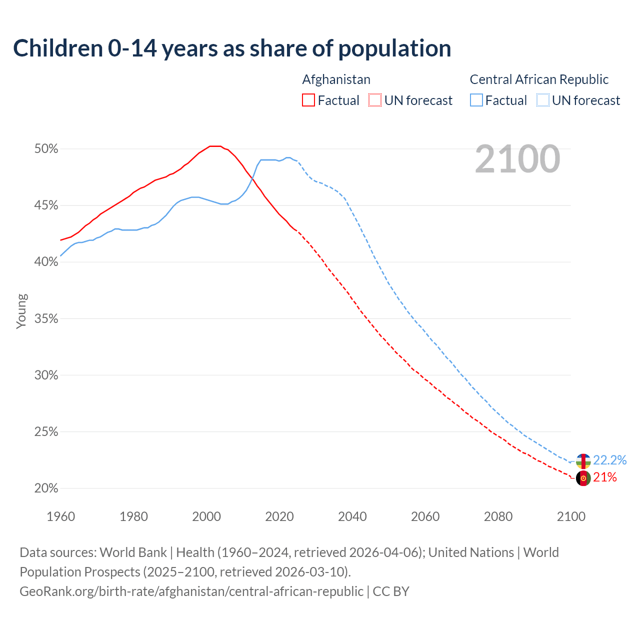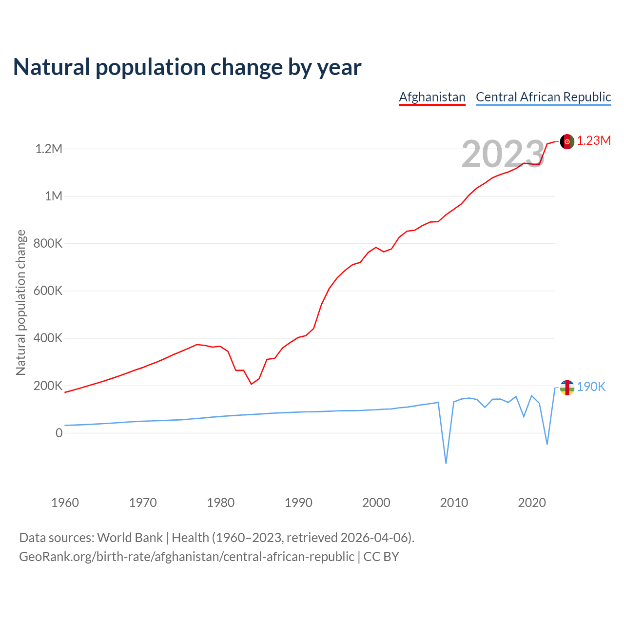 Afghanistan has an annual birth rate of 35.4 births per 1,000 people, compared to 46.4 for the Central African Republic. The average number of children a woman is expected to have during her lifetime — the fertility rate, is 4.84 in Afghanistan and 6.01 in the Central African Republic — 24.2% difference.