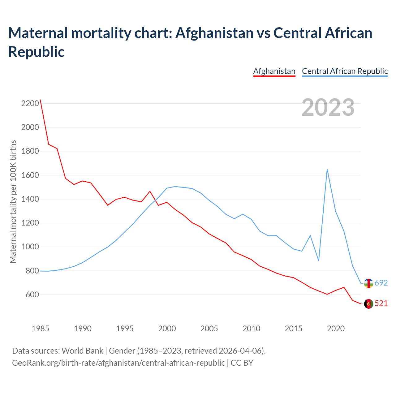 The maternal mortality rate, which is the probability of dying during childbirth or within 42 days of pregnancy termination, is 521 deaths per 100,000 live births in Afghanistan, compared to 692 deaths in the Central African Republic.