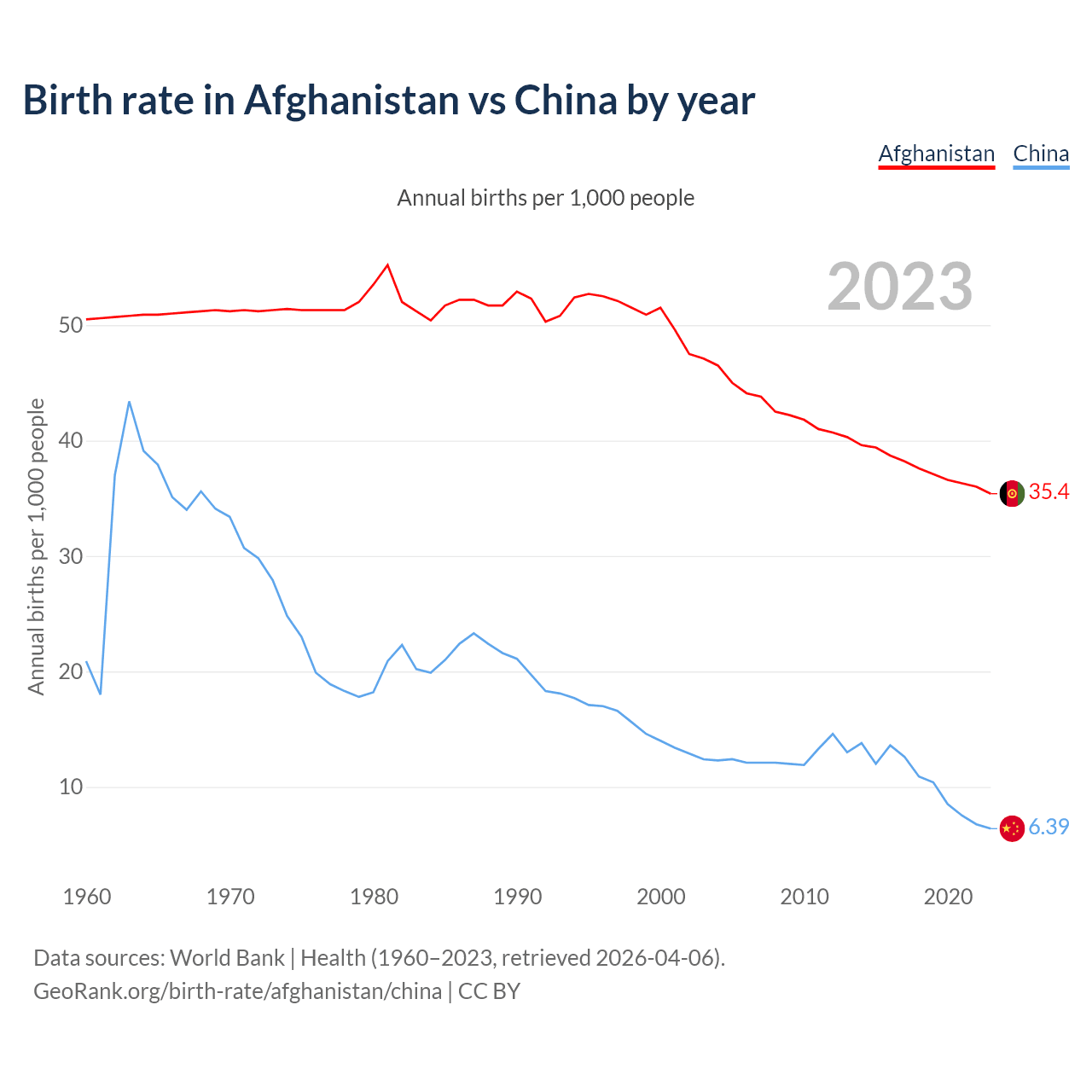 Afghanistan has an annual birth rate of 35.4 births per 1,000 people, compared to 6.39 for China. The average number of children a woman is expected to have during her lifetime — the fertility rate, is 4.84 in Afghanistan and 1 in China — 79.4% difference.