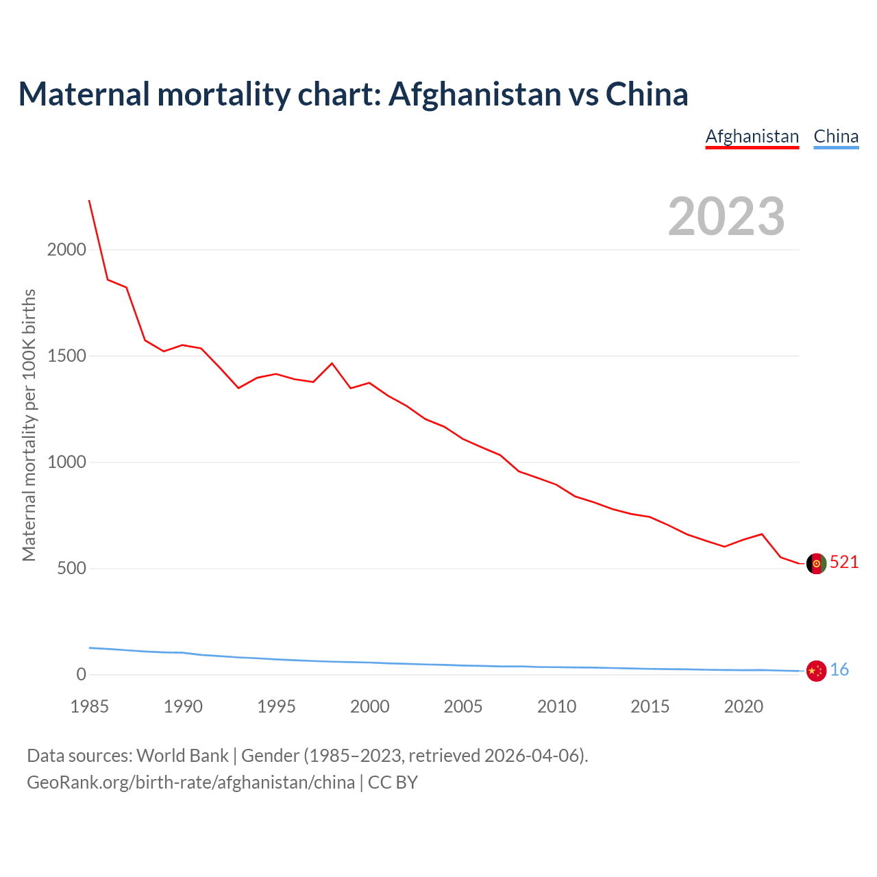 The maternal mortality rate, which is the probability of dying during childbirth or within 42 days of pregnancy termination, is 521 deaths per 100,000 live births in Afghanistan, compared to 16 deaths in China.