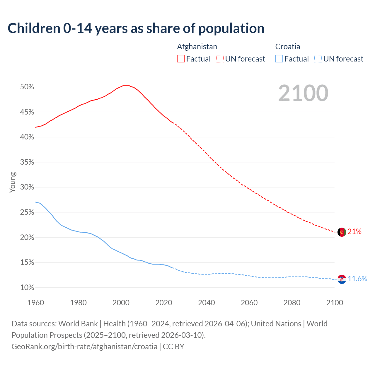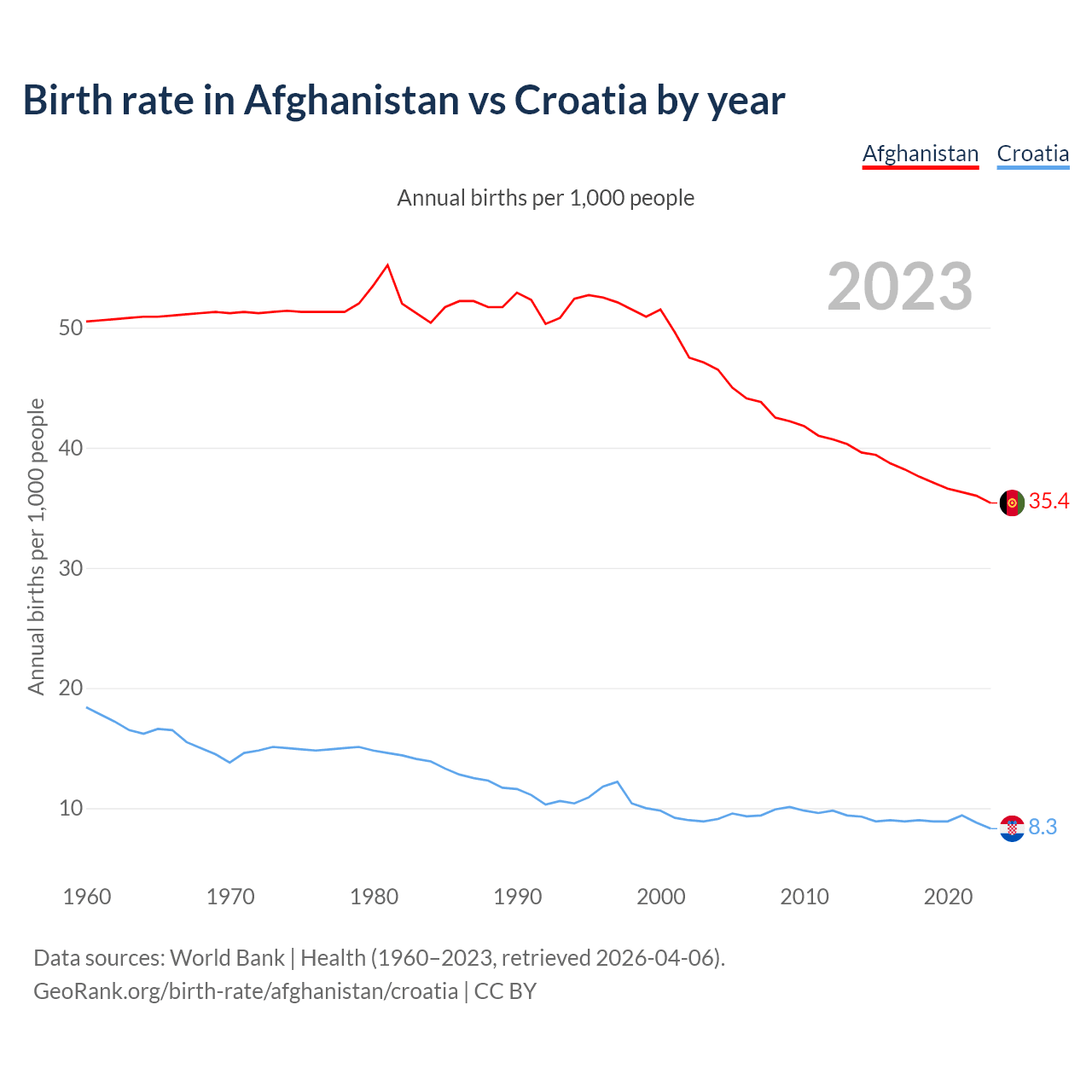 Afghanistan has an annual birth rate of 35.4 births per 1,000 people, compared to 8.3 for Croatia. The average number of children a woman is expected to have during her lifetime — the fertility rate, is 4.84 in Afghanistan and 1.46 in Croatia — 69.8% difference.