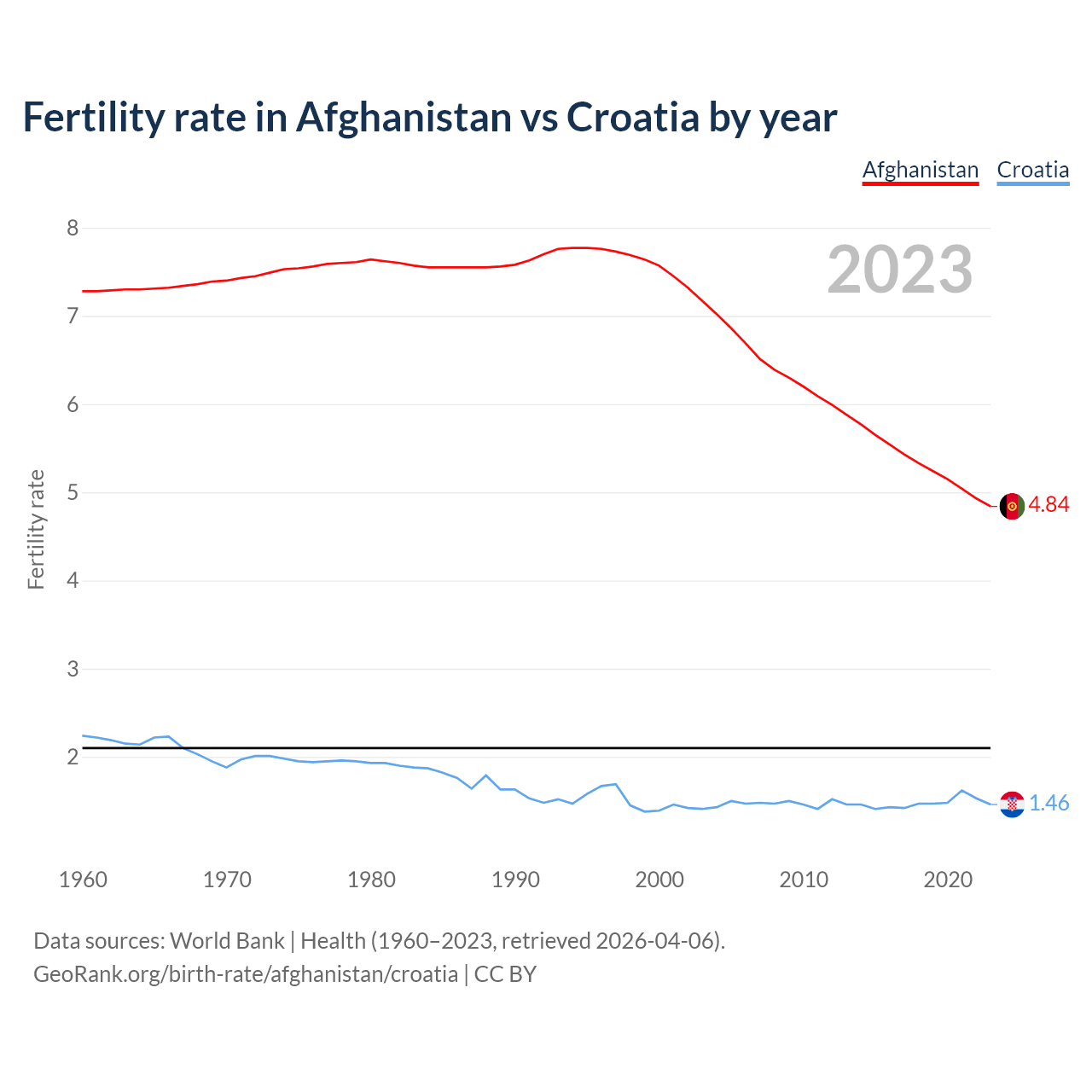 According to the latest available data on birth rates, the fertility rate in Afghanistan was 4.84 children per woman in 2023, compared to 1.46 in Croatia in 2023. The replacement level is considered to be 2.1 children per woman.