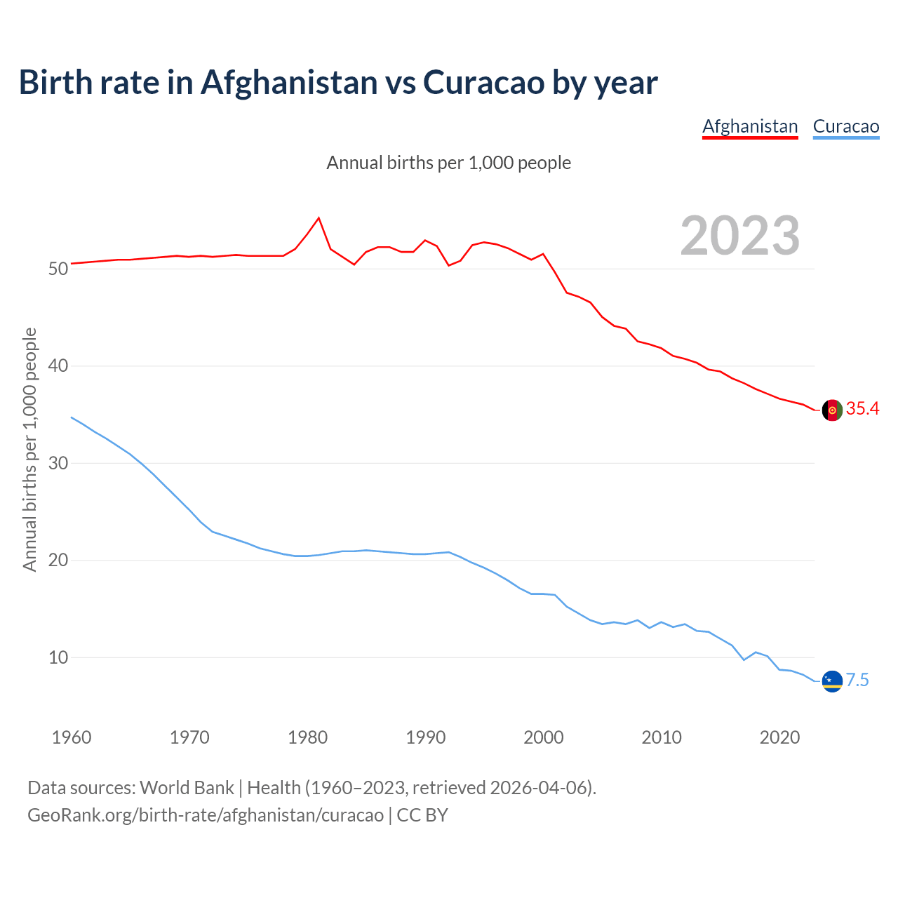 Afghanistan has an annual birth rate of 35.4 births per 1,000 people, compared to 7.5 for Curacao. The average number of children a woman is expected to have during her lifetime — the fertility rate, is 4.84 in Afghanistan and 1.2 in Curacao — 75.2% difference.