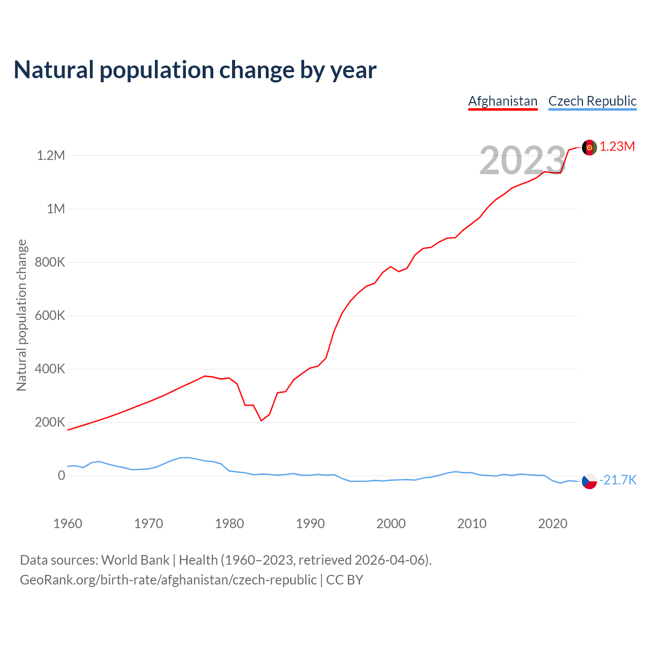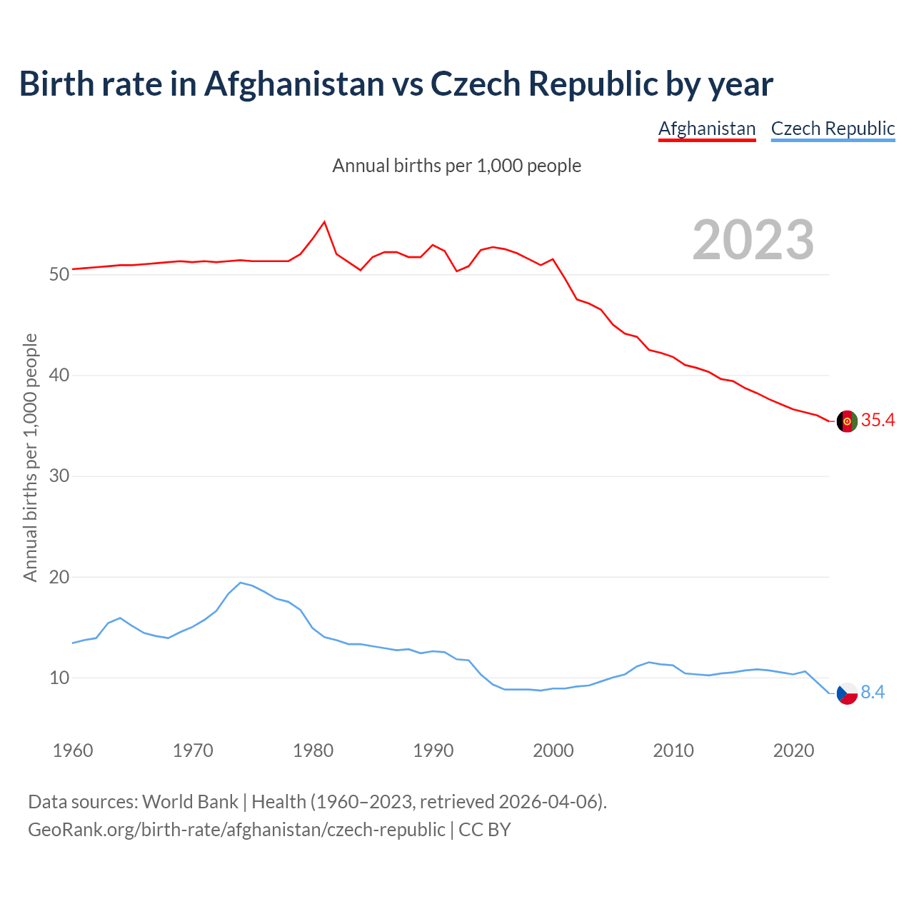 Afghanistan has an annual birth rate of 35.4 births per 1,000 people, compared to 8.4 for the Czech Republic. The average number of children a woman is expected to have during her lifetime — the fertility rate, is 4.84 in Afghanistan and 1.45 in the Czech Republic — 70% difference.