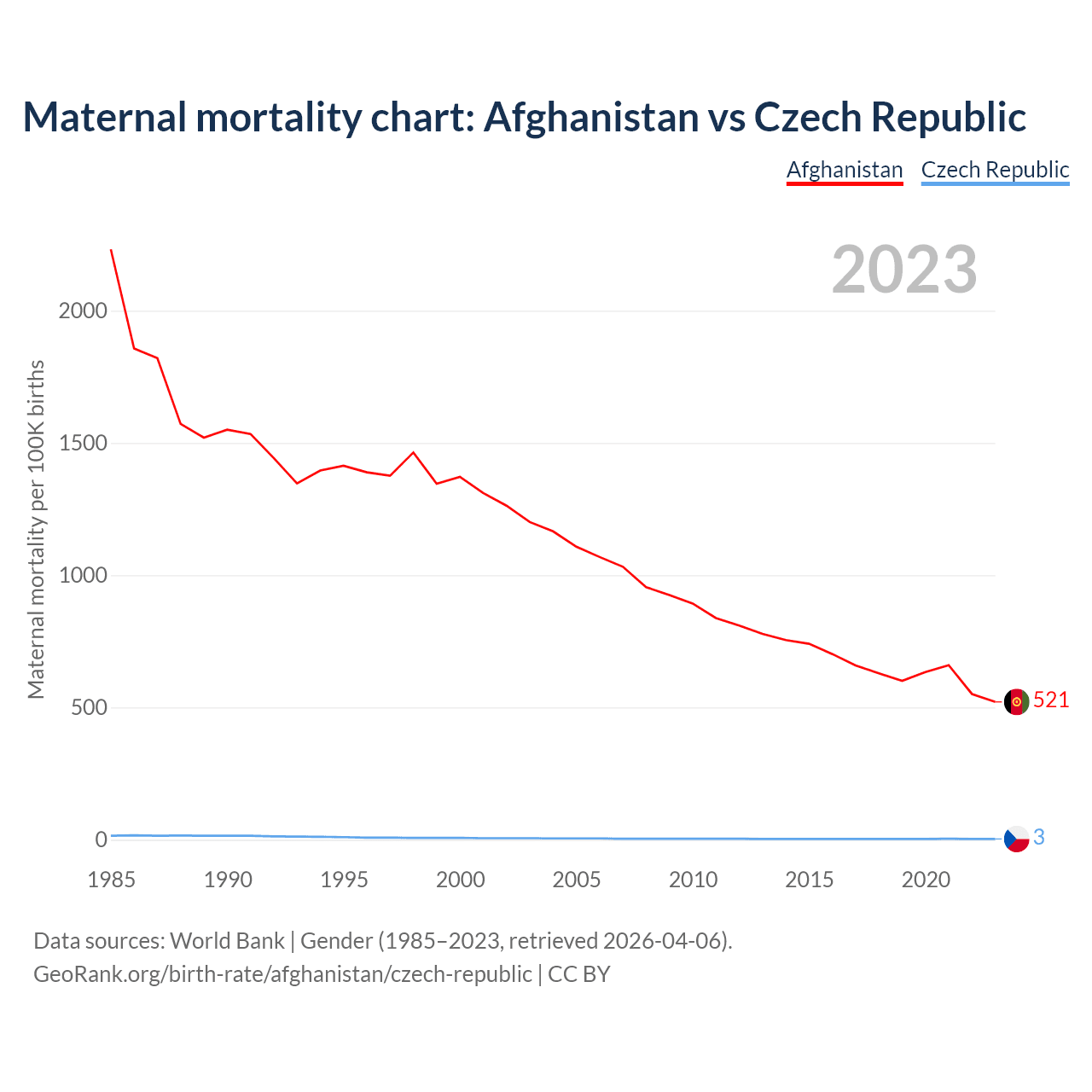 The maternal mortality rate, which is the probability of dying during childbirth or within 42 days of pregnancy termination, is 521 deaths per 100,000 live births in Afghanistan, compared to 3 deaths in the Czech Republic.