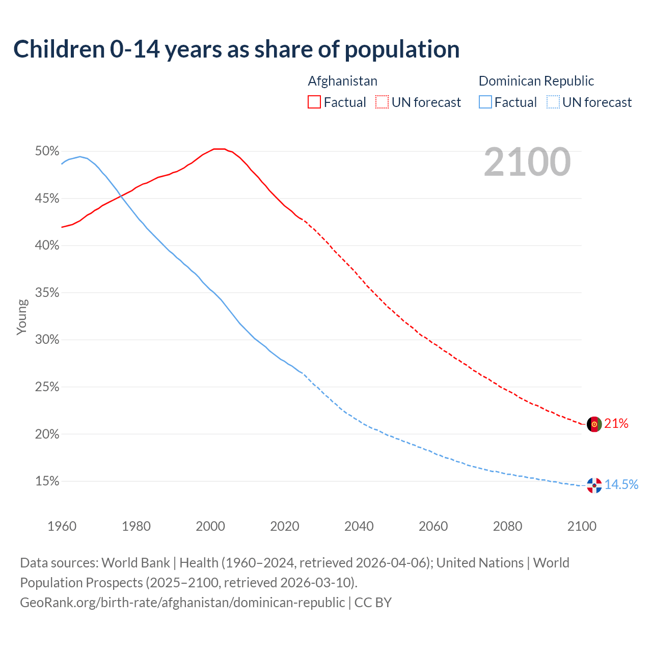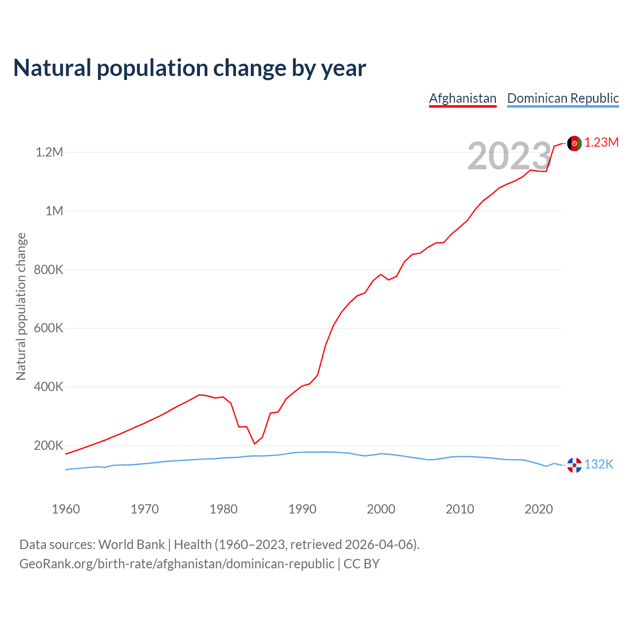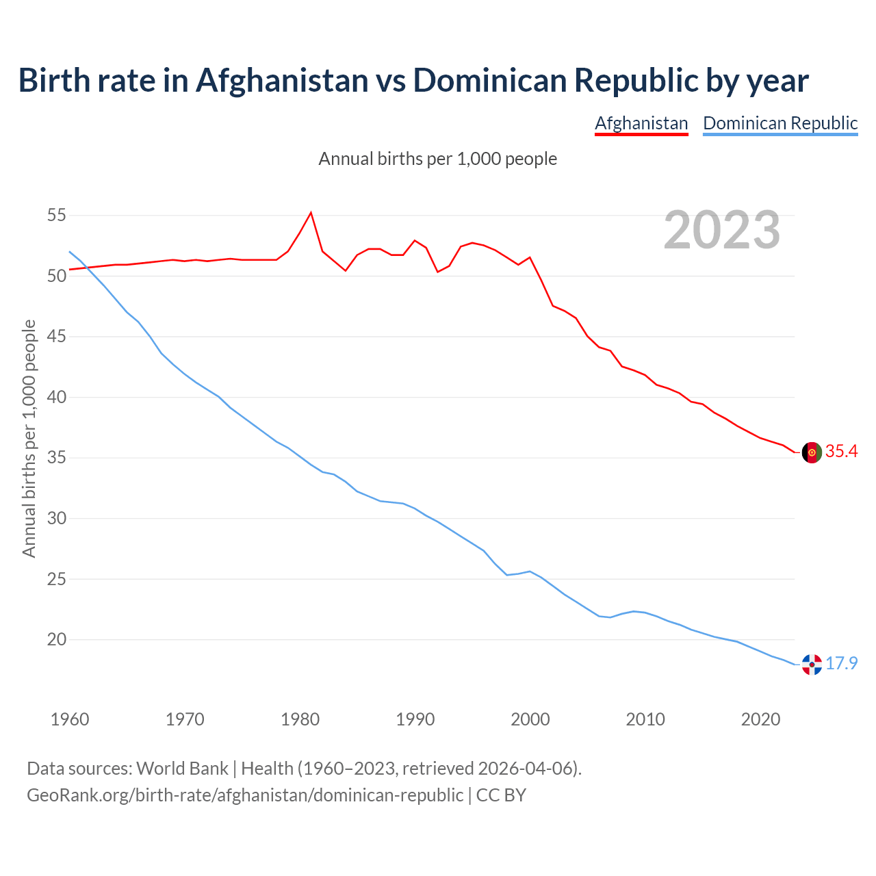 Afghanistan has an annual birth rate of 35.4 births per 1,000 people, compared to 17.9 for the Dominican Republic. The average number of children a woman is expected to have during her lifetime — the fertility rate, is 4.84 in Afghanistan and 2.24 in the Dominican Republic — 53.7% difference.