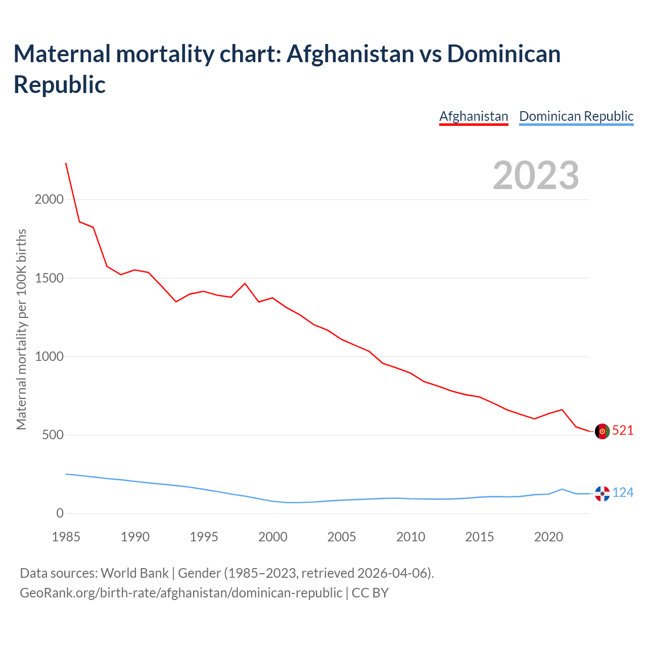 The maternal mortality rate, which is the probability of dying during childbirth or within 42 days of pregnancy termination, is 521 deaths per 100,000 live births in Afghanistan, compared to 124 deaths in the Dominican Republic.