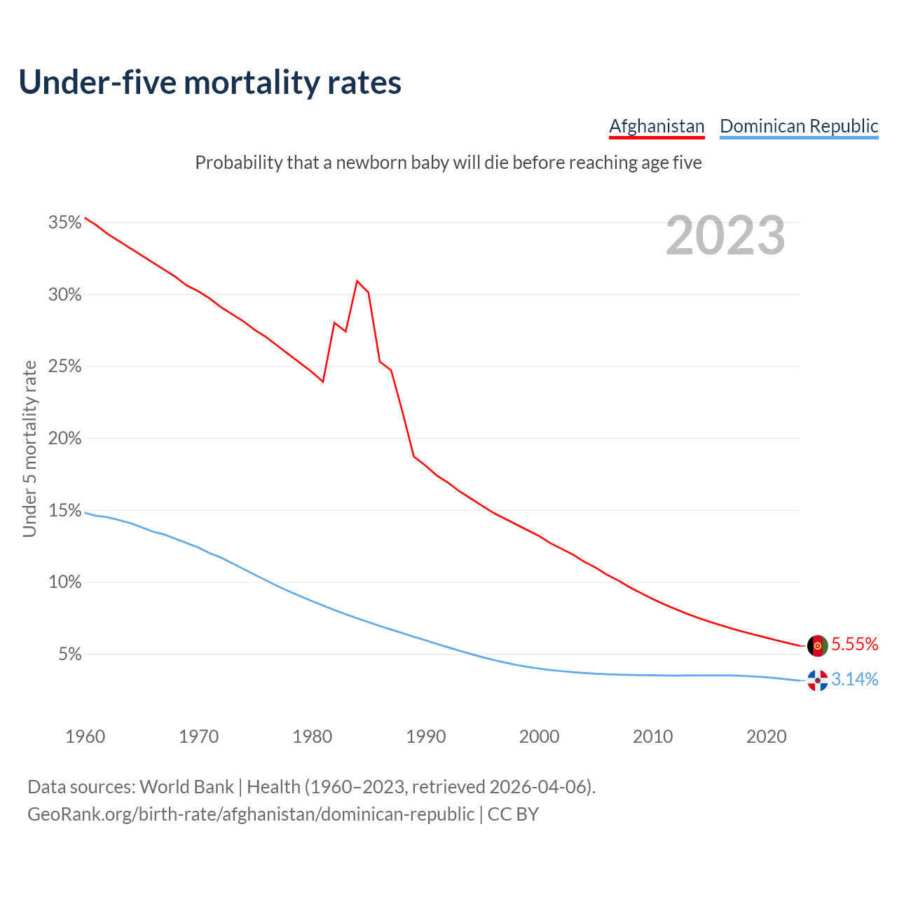 The chance that a newborn baby will die before reaching age five is 5.55% in Afghanistan and 3.14% in the Dominican Republic. Above is a chart with historical data on under-five mortality rates.