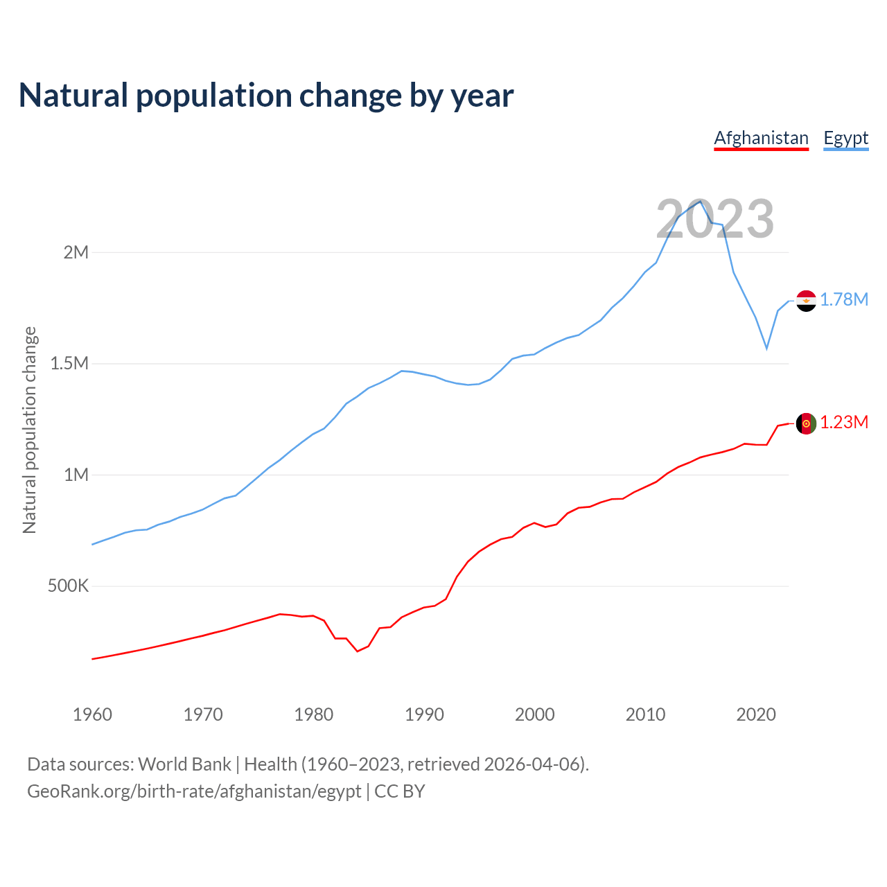 Data sources: World Bank | Health (1960–2023, retrieved 2026-04-06).