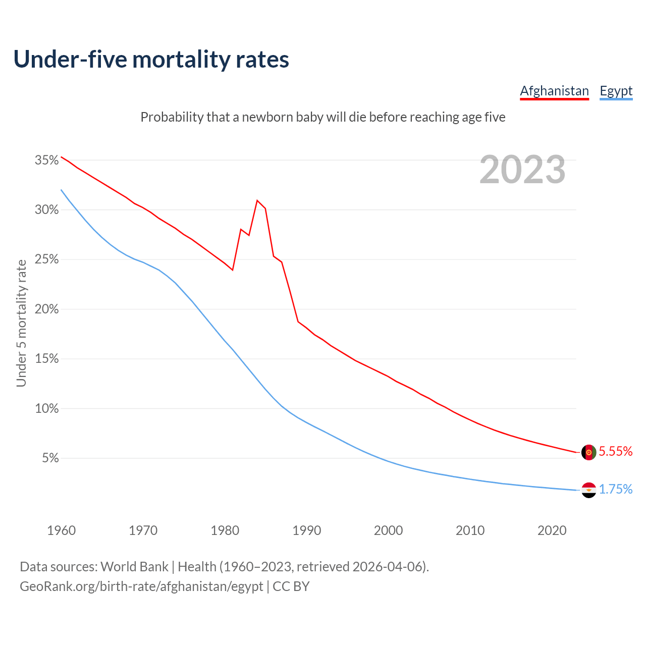 The chance that a newborn baby will die before reaching age five is 5.55% in Afghanistan and 1.75% in Egypt. Above is a chart with historical data on under-five mortality rates.