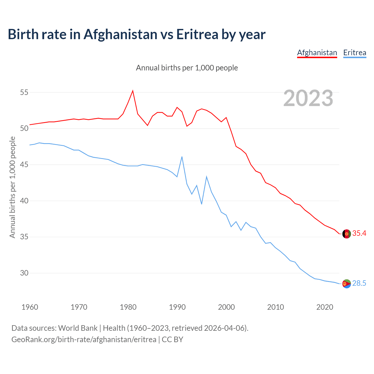 Afghanistan has an annual birth rate of 35.4 births per 1,000 people, compared to 28.5 for Eritrea. The average number of children a woman is expected to have during her lifetime — the fertility rate, is 4.84 in Afghanistan and 3.71 in Eritrea — 23.3% difference.