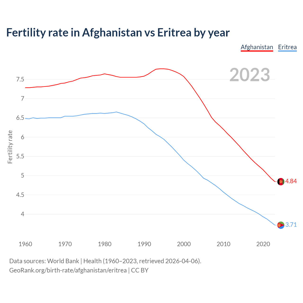 According to the latest available data on birth rates, the fertility rate in Afghanistan was 4.84 children per woman in 2023, compared to 3.71 in Eritrea in 2023. The replacement level is considered to be 2.1 children per woman.