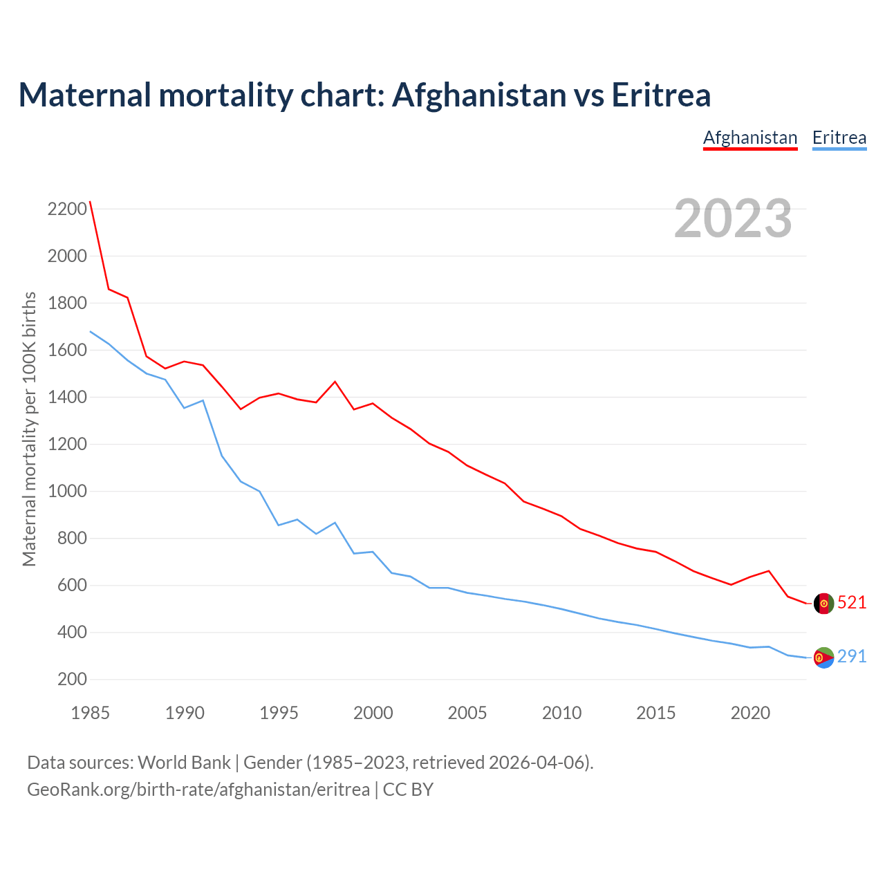 - Annual births per 1,000 women ages 15-19 (adolescent birth rate or teenage mother rate) is 64.1 in Afghanistan vs 65.2 in Eritrea.