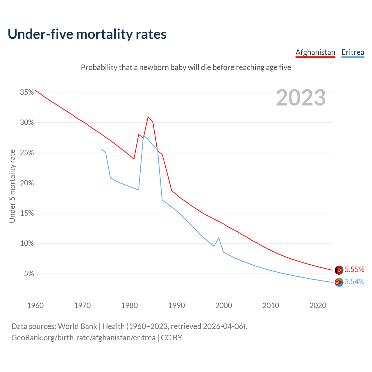 The chance that a newborn baby will die before reaching age five is 5.55% in Afghanistan and 3.54% in Eritrea. Above is a chart with historical data on under-five mortality rates.