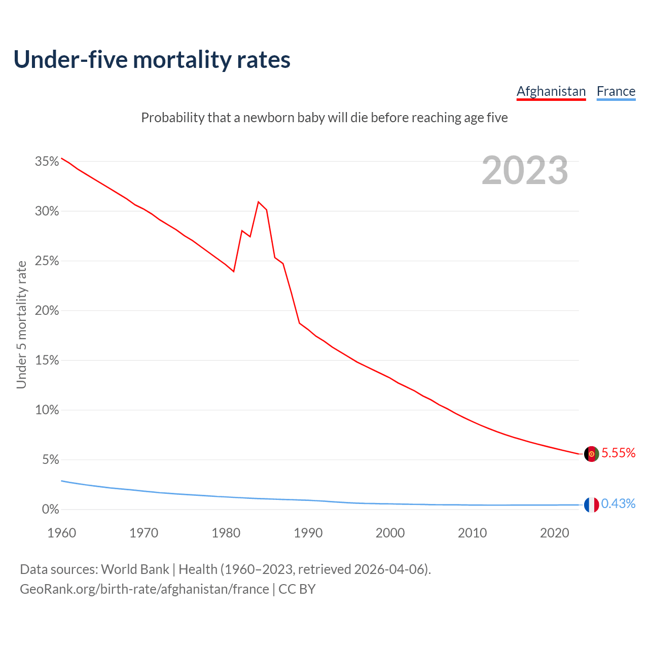 The chance that a newborn baby will die before reaching age five is 5.55% in Afghanistan and 0.43% in France. Above is a chart with historical data on under-five mortality rates.