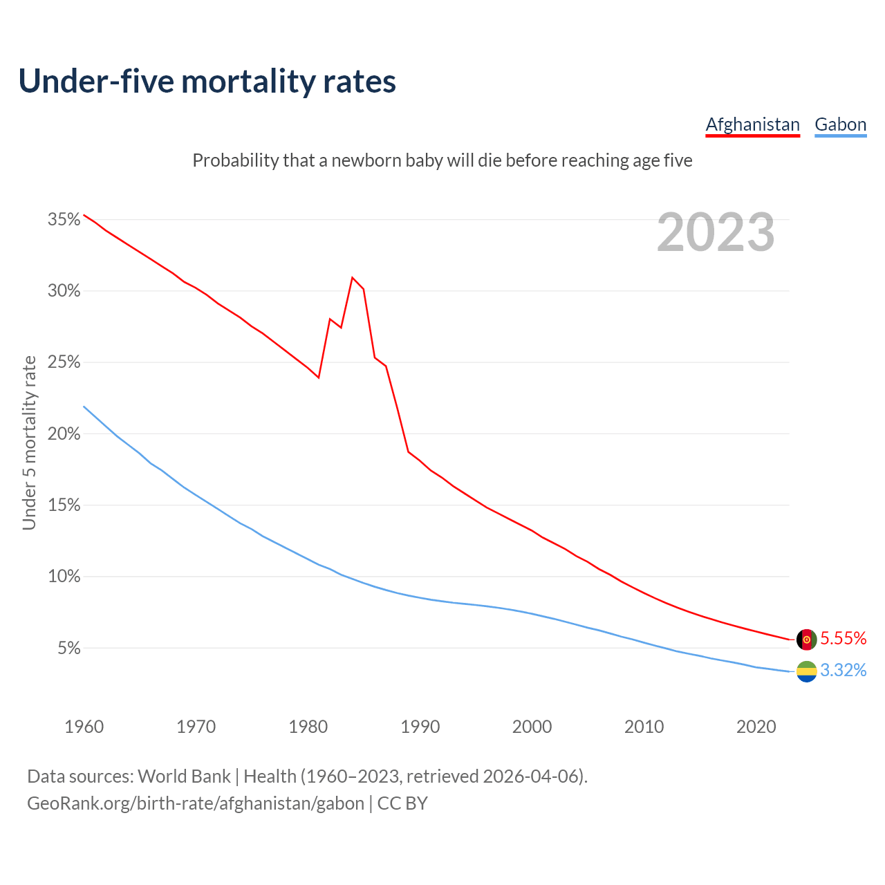 The chance that a newborn baby will die before reaching age five is 5.55% in Afghanistan and 3.32% in Gabon. Above is a chart with historical data on under-five mortality rates.