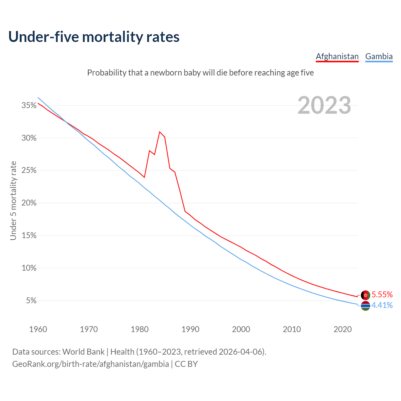The chance that a newborn baby will die before reaching age five is 5.55% in Afghanistan and 4.41% in the Gambia. Above is a chart with historical data on under-five mortality rates.