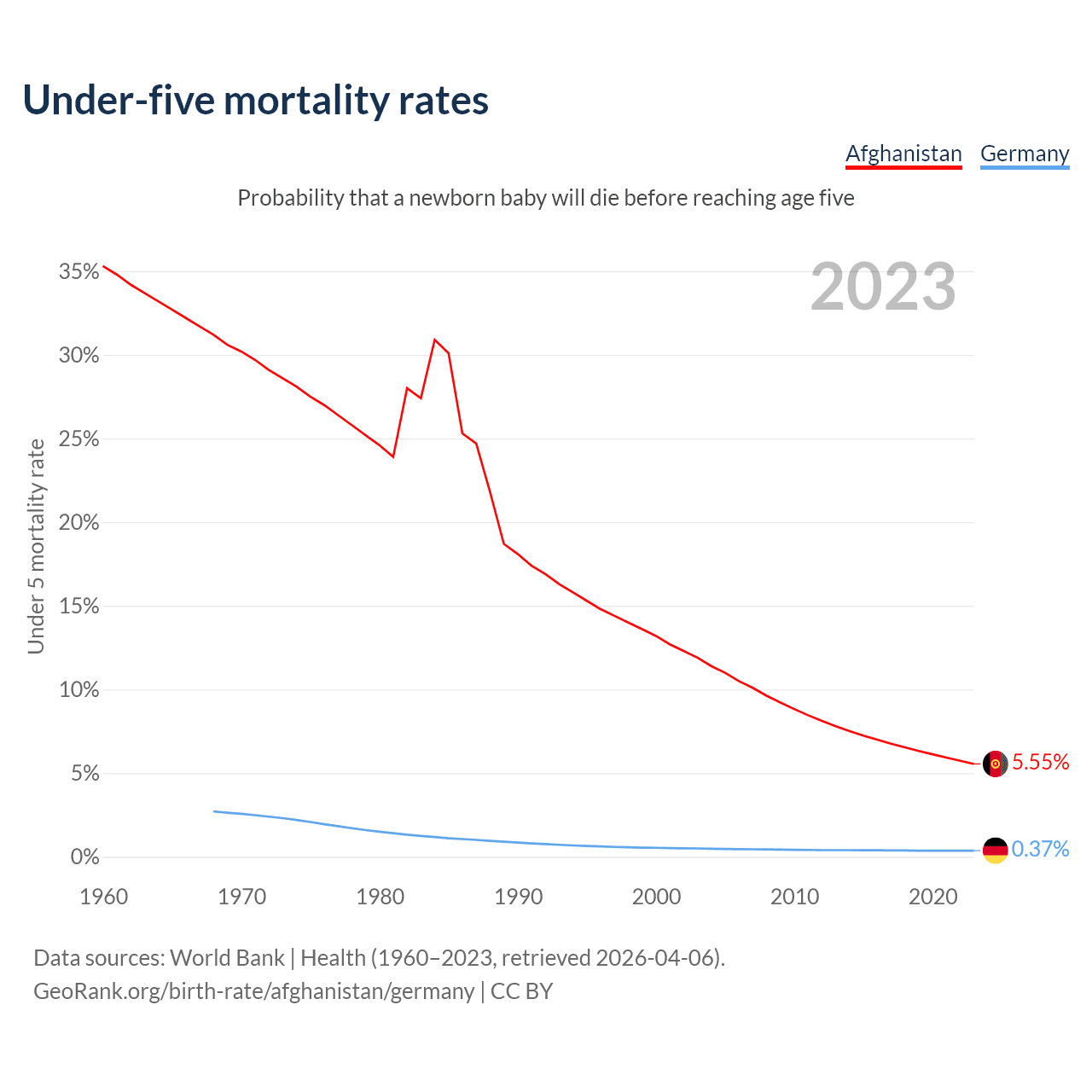 The chance that a newborn baby will die before reaching age five is 5.55% in Afghanistan and 0.37% in Germany. Above is a chart with historical data on under-five mortality rates.